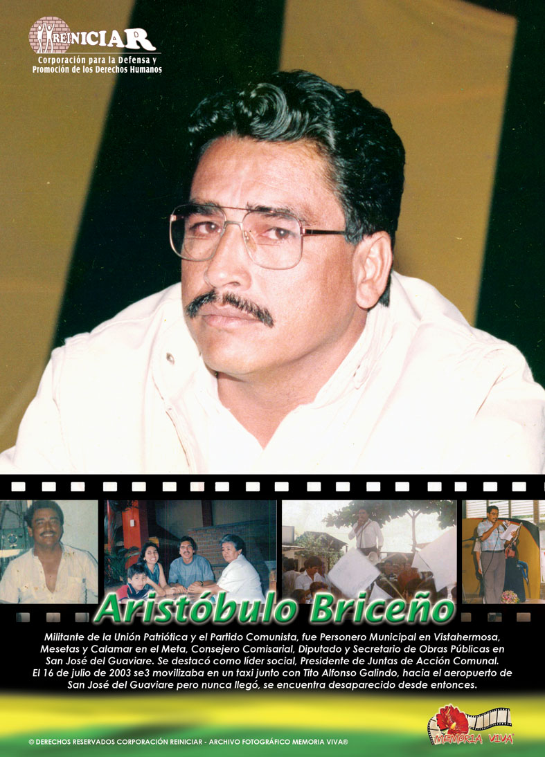 El 16 de julio de 2003 en San José del Guaviare, Guaviare, el militante de la Unión Patriótica y el Partido Comunista, ARISTÓBULO BRICEÑO se movilizaba en un taxi junto con TITO ALFONSO GALINDO, hacia el aeropuerto de la localidad pero nunca llegaron, y se encuentran desaparecidos desde entonces. Briceño fue Personero Municipal de Vistahermosa, Mesetas y Calamar en el Meta, Consejero Comisarial, Diputado y Secretario de Obras Públicas en San José de Guaviare. Se destacó como líder social, Presidente de Juntas de Acción Comunal (1).