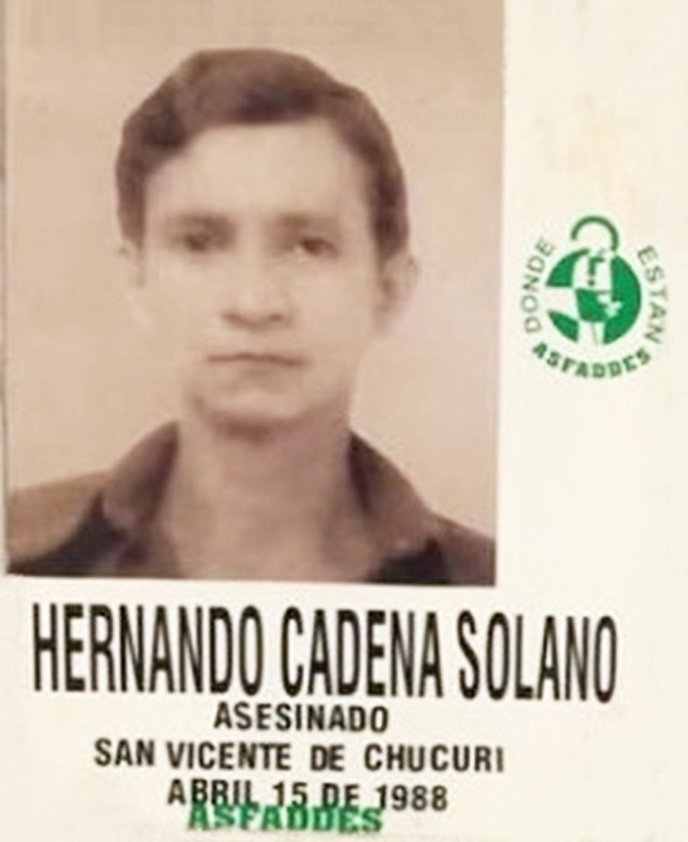 Fecha: 1988-04-15 Departamento: Santander Municipio: San Vicente de Chucurí Presuntos responsables: 1-Sin información Hechos Víctimas en estos hechos: (Asesinadas: - Desaparecidas: ) El 15 de abril de 1988 en San Vicente de Chucurí, Santander, fue asesinado HERNANDO CADENA SOLANO. Fuentes: 1-ASFADDES Información Relacionada 1-HERNANDO CADENA SOLANO - ASFADDES.jpg Víctimas de la Masacre Hernando Cadena Solano (Asesinato) To top