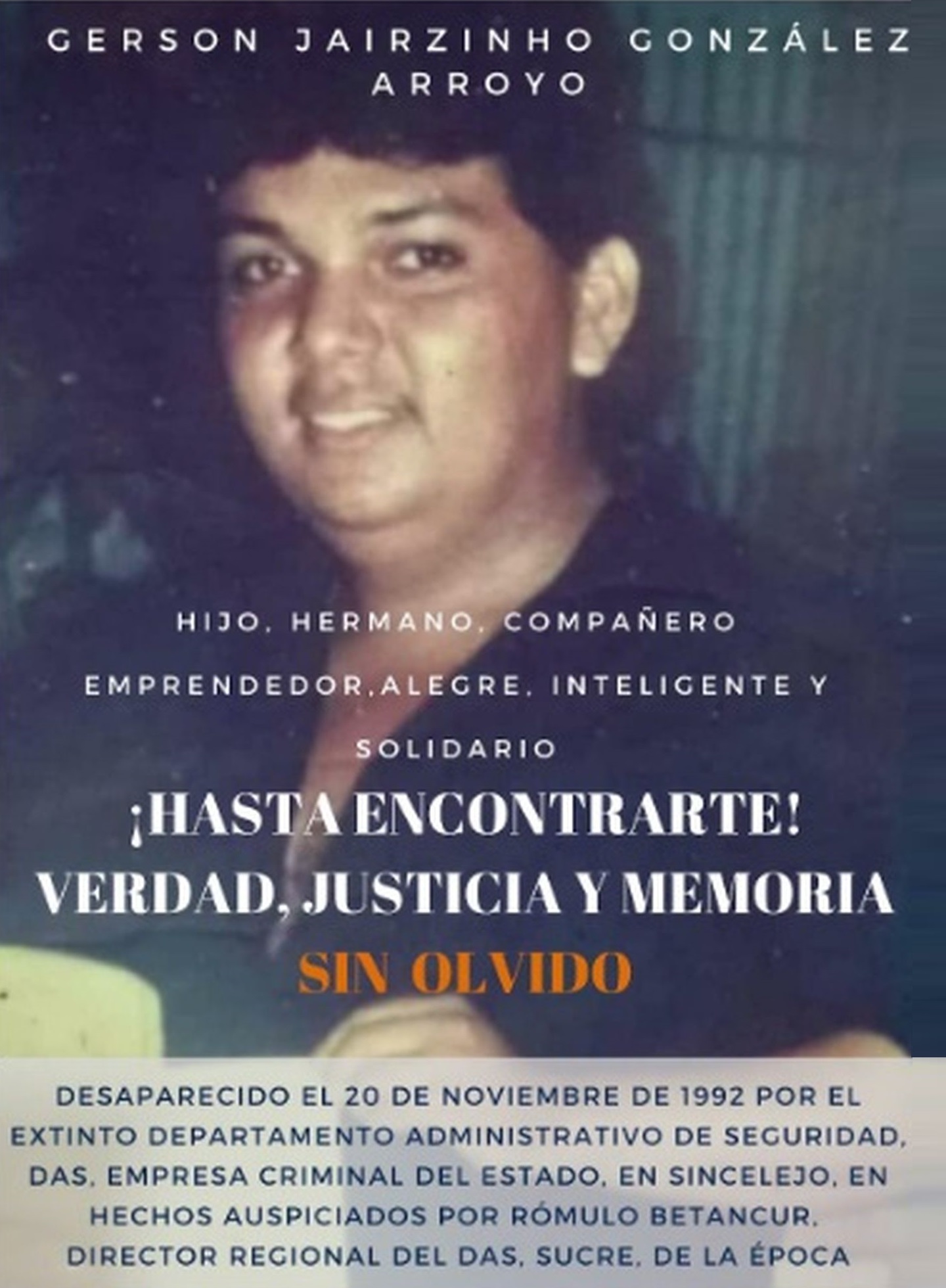 El 20 de noviembre de 1992 en Sincelejo, Sucre, miembros del DAS detuvieron y obligaron a abordar una camioneta Toyota color blanca a GERSON JAIRZINHO GONZÁLEZ ARROYO, 17 años. Desde ese entonces no se ha vuelto a saber de él.