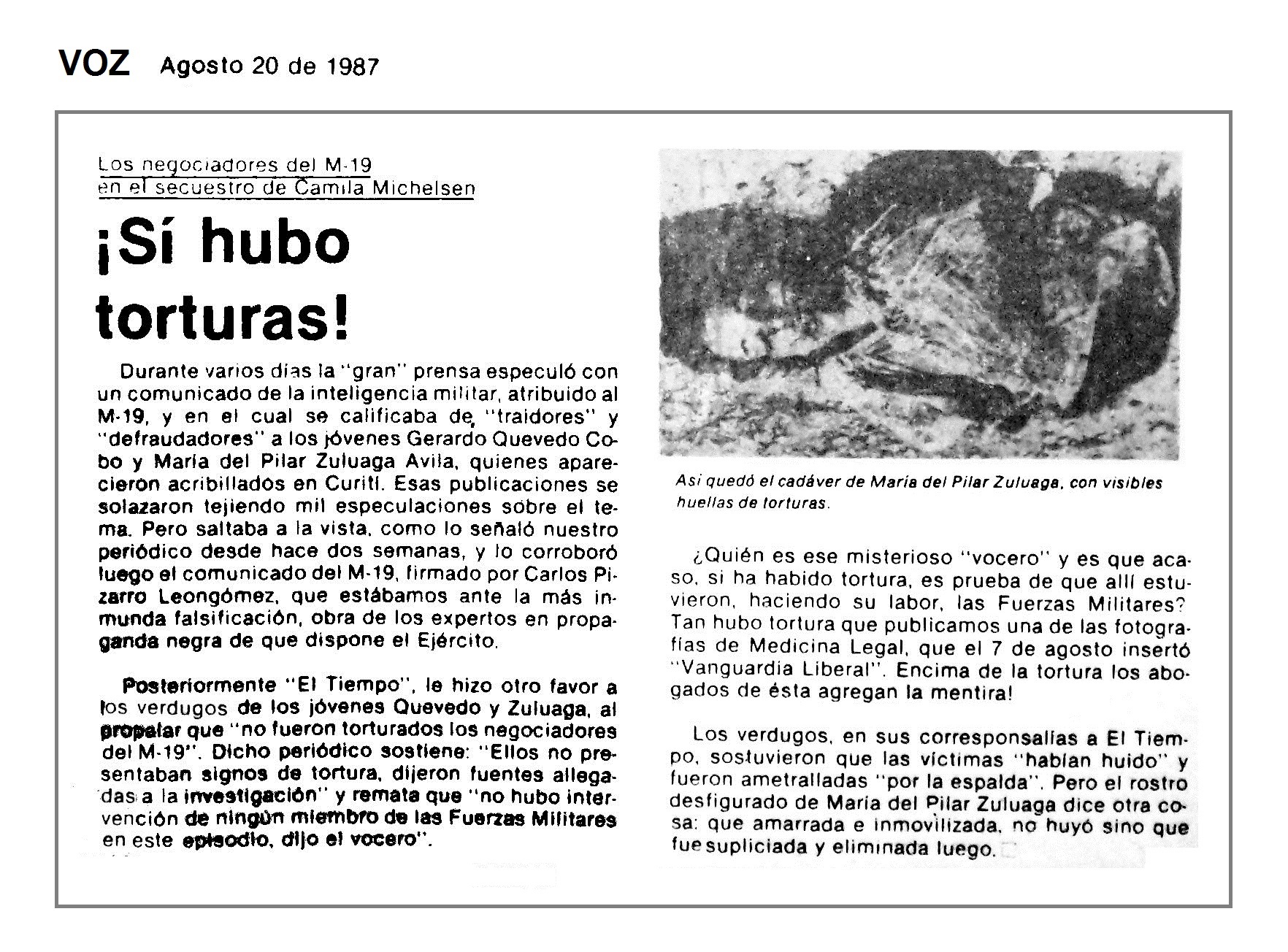 El 28 de mayo de 1987 en Bogotá, D.C., agentes del estado Colombiano secuestraron cuando salían de las instalaciones del aeropuerto El Dorado a los militantes del M-19, GERARDO QUEVEDO COBOS, de 38 años, ingeniero industrial, y a su compañera MARÍA DEL PILAR ZULUAGA ÁVILA, 28 años, trabajadora social. El 6 de agosto 1987 fueron identificados sus cuerpos, enterrados como N.N. porque no llevaban identificación, en la vereda Llanos de Navas del municipio de Curití (Santander); su muerte violenta se había producido el 1° de junio anterior. Según testimonios: “los dos cuerpos tenían 12 impactos de bala de pistola calibre 45" (Fuentes: CPDH COMITE PERMANENTE POR LA DEFENSA DE LOS DERECHOS HUMANOS - Itinerario de la Represión y la Violencia Institucionalizadas • Colombia 1987 / In Memoriam : María del Pilar Zuluaga - oigahermanohermana.org, 21 enero 2015)