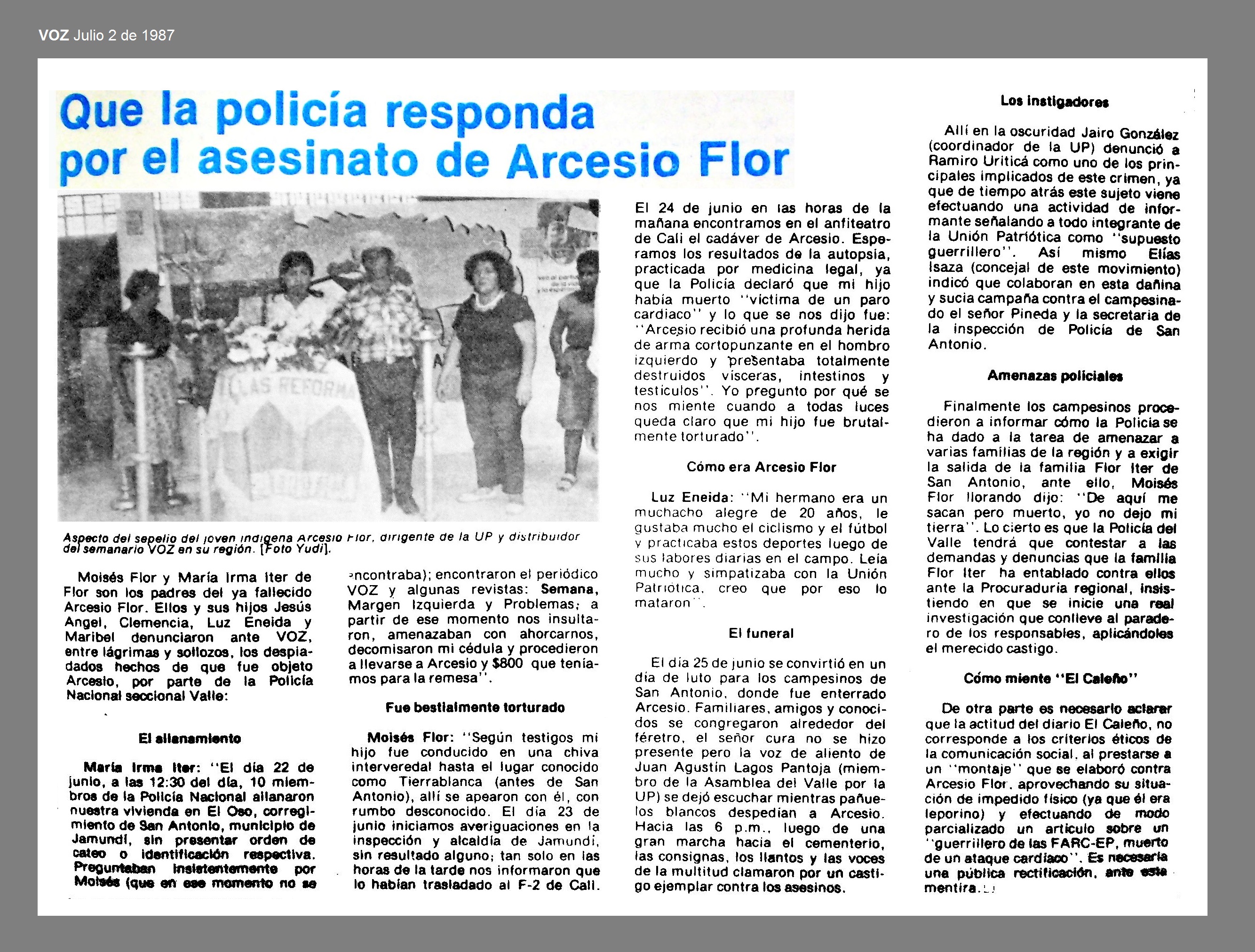 El 22 de junio de 1987 a las 12:30 del día, miembros de la policía nacional allanaron la vivienda de la familia Flor en El Oso, corregimiento de San Antonio, municipio de Jamundí, sin presentar orden de cateo o identificación respectiva, llevándose a ARCESIO FLOR, indígena de 20 años, dirigente de la Unión Patriótica y distribuidor del semanario VOZ en su región. Según testigos el joven fue conducido en una chiva interveredal hasta el lugar conocido como Terrablanca, allí se apearon con él, con rumbo desconocido. El día 23 de junio las autoridades informaron a la familia que lo habían trasladado al F-2 de Cali. El 24 de junio en las horas de la mañana los familiares de Arcesio encontraron su cadáver en el anfiteatro de Cali (1).