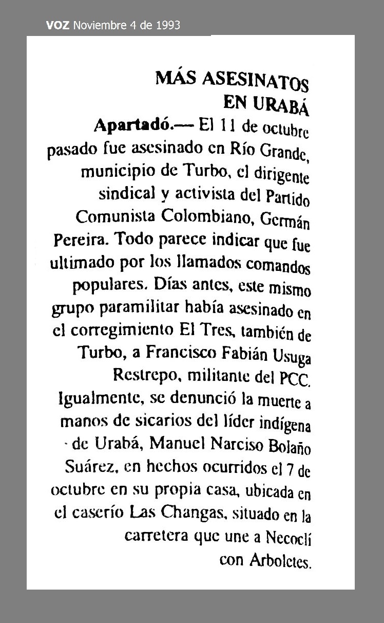 El 12 de octubre de 1993 en Apartadó, Antioquia, miembros de los Comandos Populares, agrupación paramilitar de Esperanza, Paz y Libertad, asesinaron en la finca Carmen Alicia a GERMÁN PEREIRA, trabajador del predio (1). Estaba afiliado a SINTRAINAGRO Sindicato Nacional de Trabajadores de la Industria del Agro (2). Era militante de la Unión Patriótica (3).