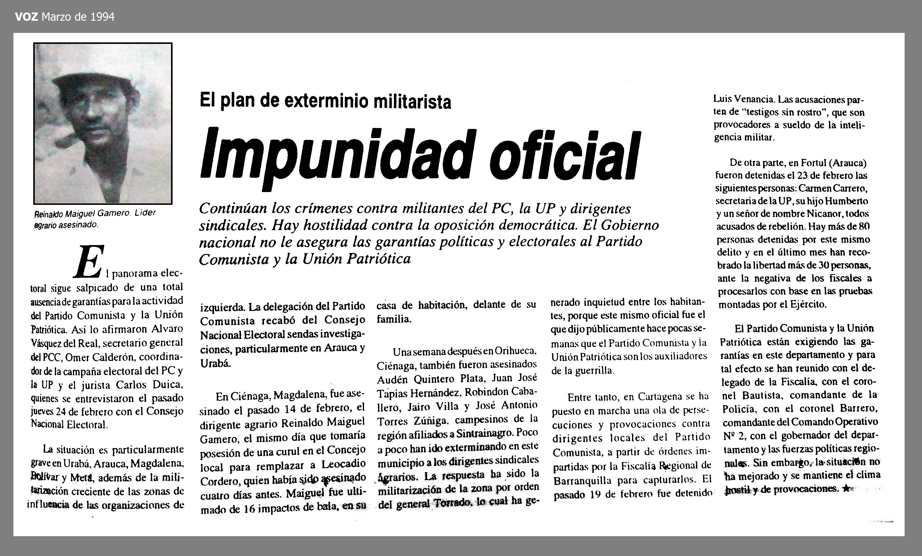 El 14 de febrero de 1994 en Ciénaga, Magdalena, paramilitares ejecutaron a REINALDO ALFONSO MAIGUEL GAMERO, militante de la Unión Patriótica, secretario seccional de SINTRAINAGRO e integrante del Movimiento Cívico Comunal. El hecho sucedió cuando la víctima salía de su vivienda ubicada en el barrio El Polvorín. Al día siguiente Reinaldo se iba a posesionar como concejal del municipio, en reemplazo de Leocadio Cordero Durán, ejecutado una semana antes (1).