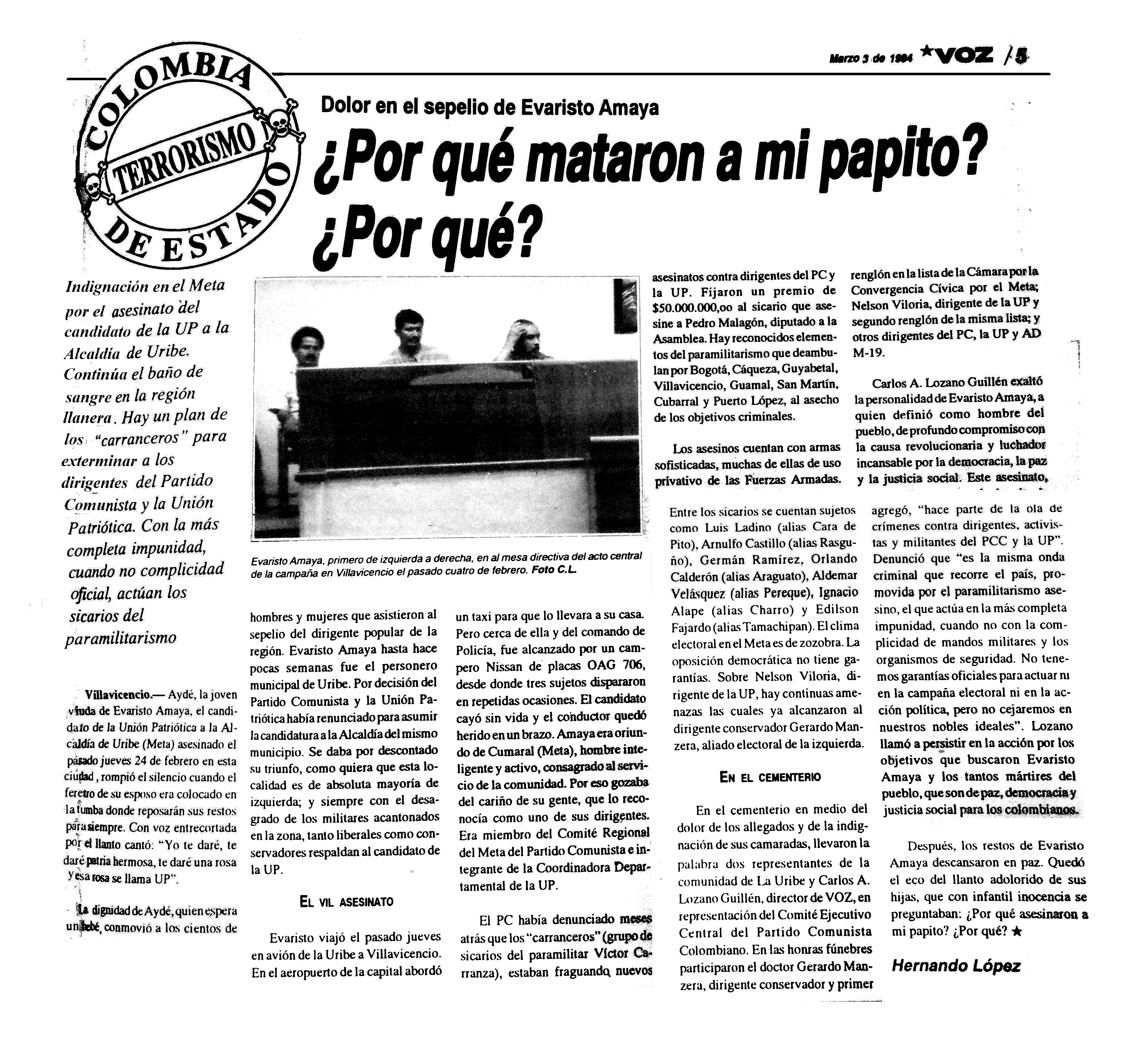 El 24 de febrero de 1994 en Villavicencio, Meta, el candidato por la Unión Patriótica a la alcaldía de La Uribe, EVARISTO AMAYA MORALES, de 34 años, fue asesinado en el barrio Santa Josefa, por miembros de la Policía que se movilizaban en un campero Nissan amarillo, de placas A06706, quienes le dispararon en momentos en que se transportaba en un taxi. El dirigente fue seguido desde el aeropuerto Vanguardia, por el cual había ingresado a la ciudad. Amaya Morales fue funcionario de la Beneficencia Departamental del Meta, asistente parlamentario en el Congreso de la República, secretario general de la Contraloría del departamento y Personero de La Uribe, cargo al que renunció para presentar su candidatura a la alcaldía. Al momento del crimen, tenía un niño de 4 años y su esposa estaba en el cuarto mes de embarazo de su segundo hijo (1).