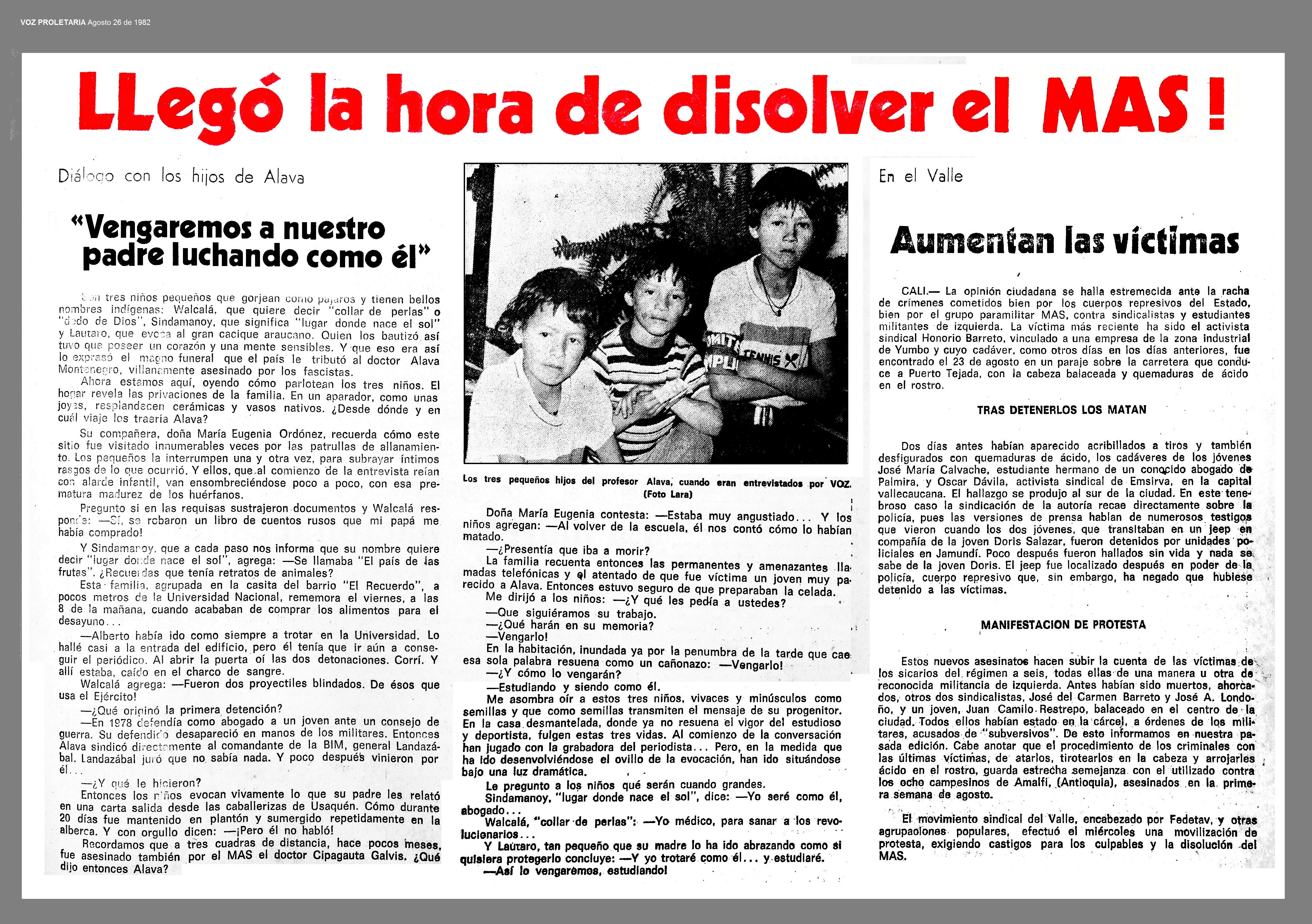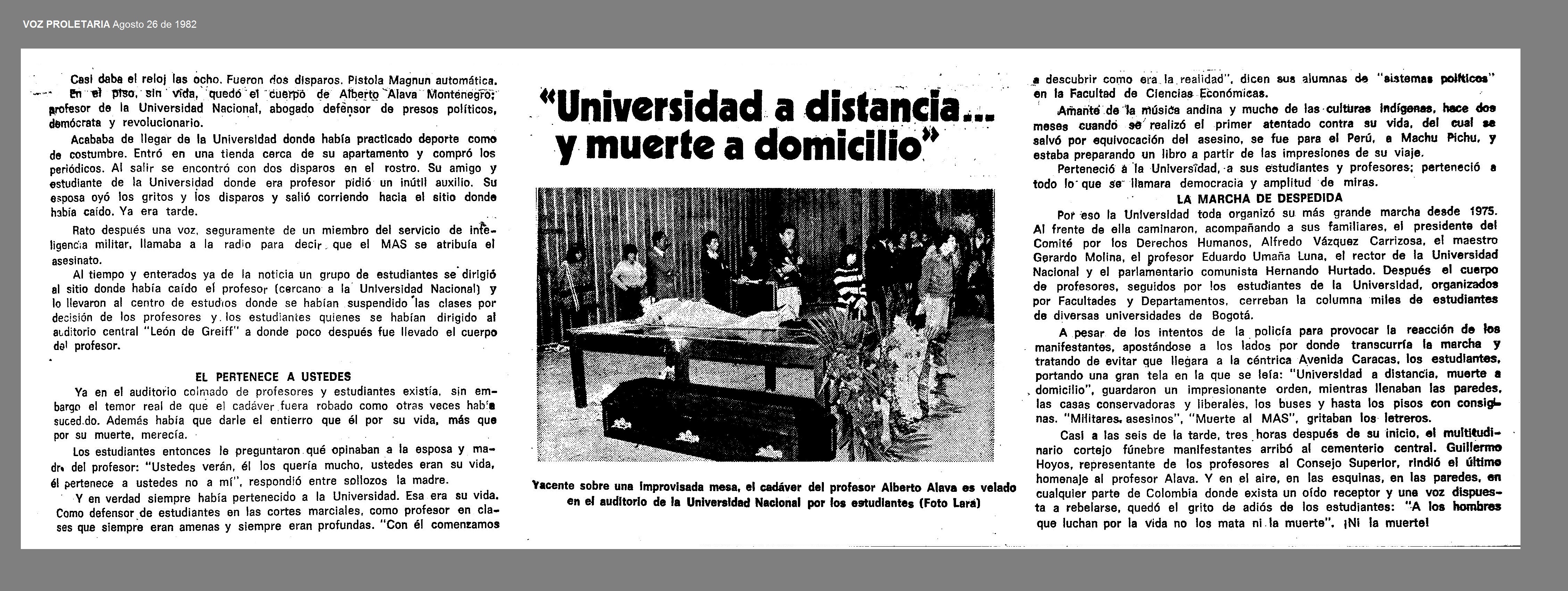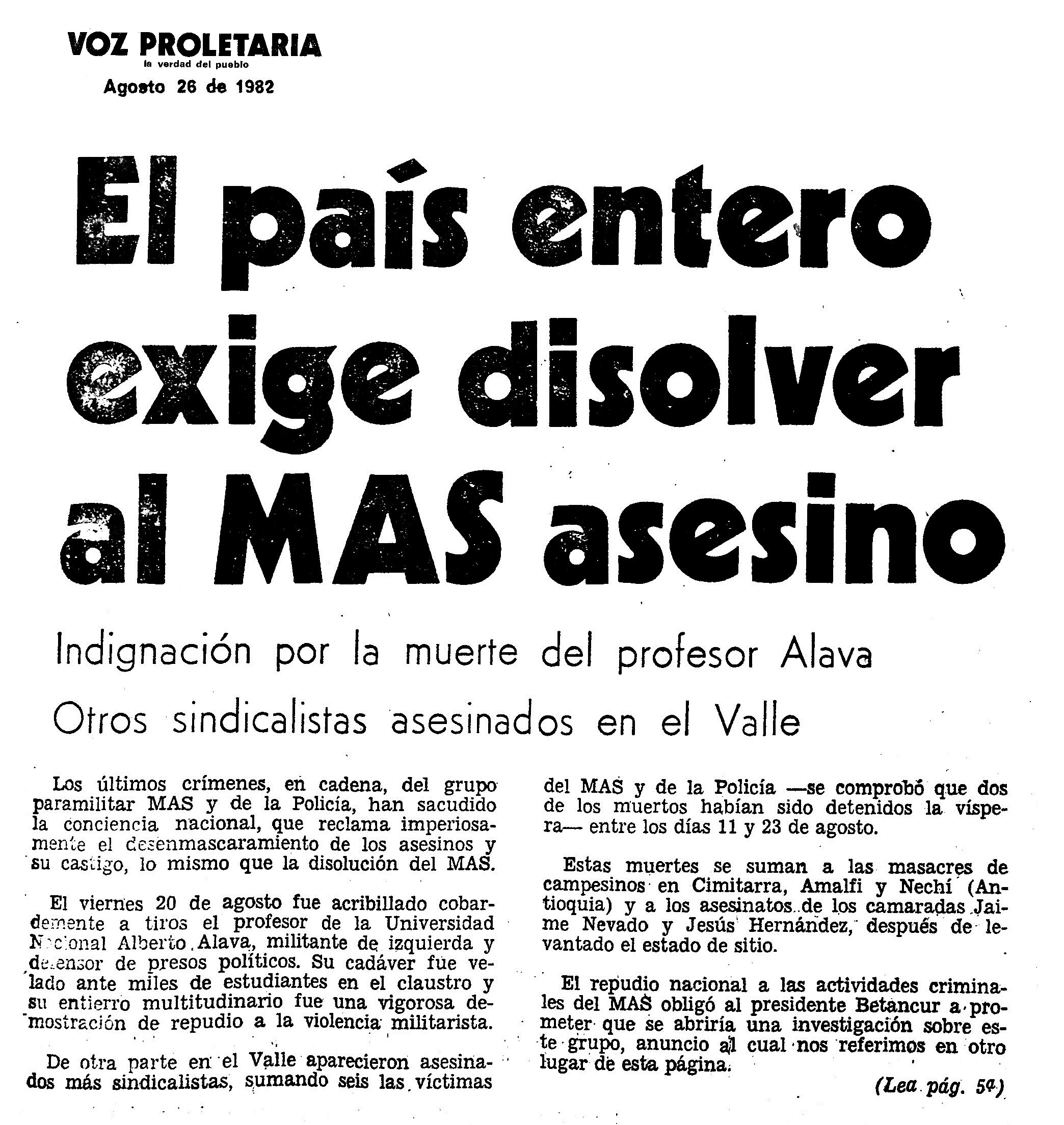 El 20 de agosto de 1982 en Bogota, D.C., es asesinado ALBERTO ALAVA MONTENEGRO, profesor de la Universidad Nacional. Los sicarios que lo acribillaron en frente de su hogar, junto al campus, se presentaron como el MAS (Muerte a Secuestradores) y se refirieron a su víctima como ''abogado de secuestradores''. Se trataba de una de las primeras incursiones públicas del aparato paraestatal cuyo nacimiento oficial se asocia con la reacción de los narcos antioqueños al secuestro de Nieves Ochoa, hermana de los líderes de uno de los clanes más importantes del Cártel de Medellín (1).