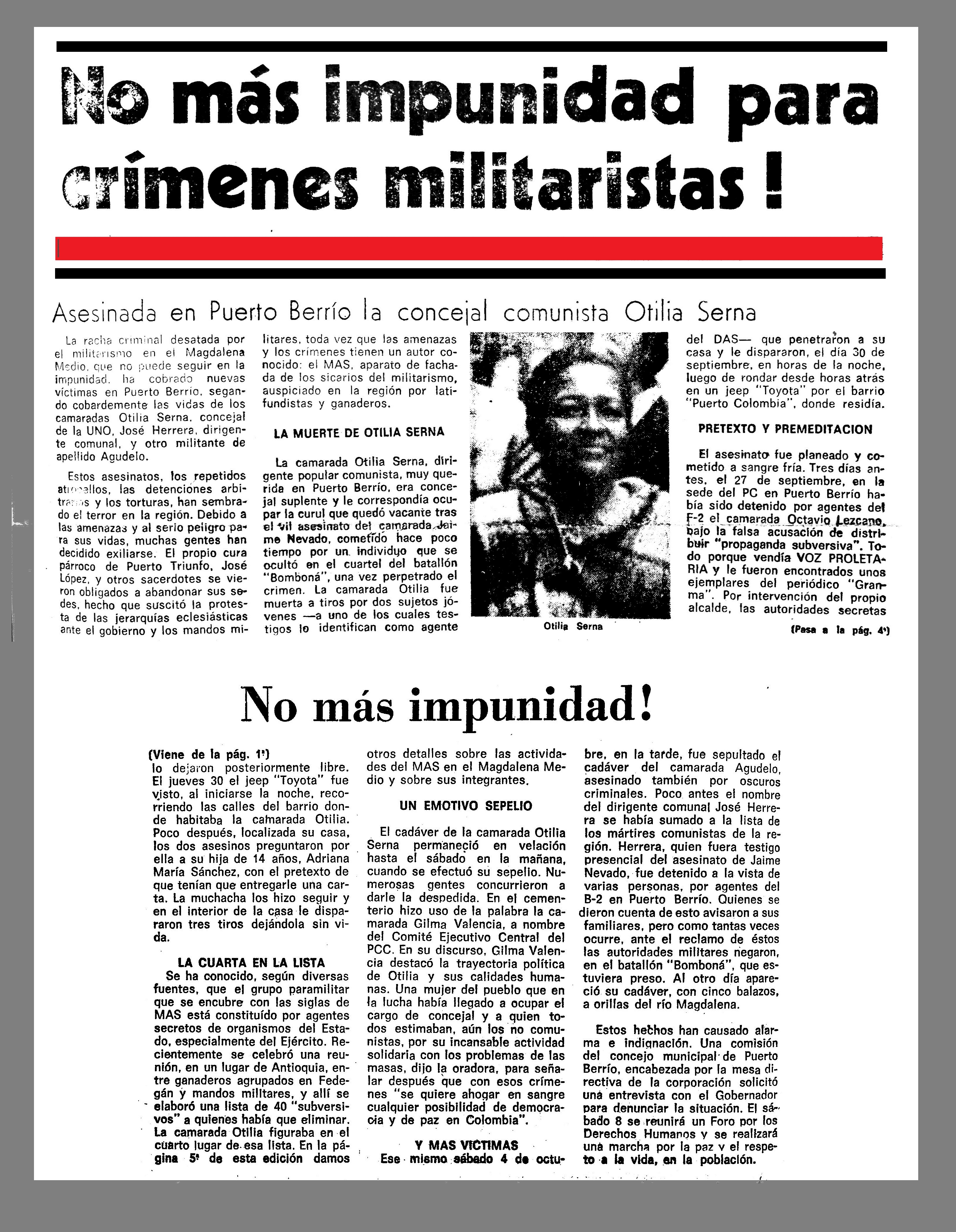 Jairo Agudelo Jairo Agudelo Fuente: Edad: 33 Género: M Afiliación política: 1. PCC Partido Comunista Colombiano Fecha: 1982-10-01 Tipo Victima: Asesinato Departamento: Antioquia Municipio: Puerto Berrío Presuntos responsables: 1. Paramilitares (MAS Muerte a Secuestradores) Hechos El 1 de octubre de 1982 en Puerto Berrío, Antioquia, paramilitares del MAS asesinaron a JAIRO AGUDELO de 33 años de edad, dirigente comunista. Fuentes: 1. COLOMBIA NUNCA MAS Puerto Berrío Información Relacionada 1. VOZ - NO MAS IMPUNIDAD PARA CRIMENES MILITARISTAS.JPG To top