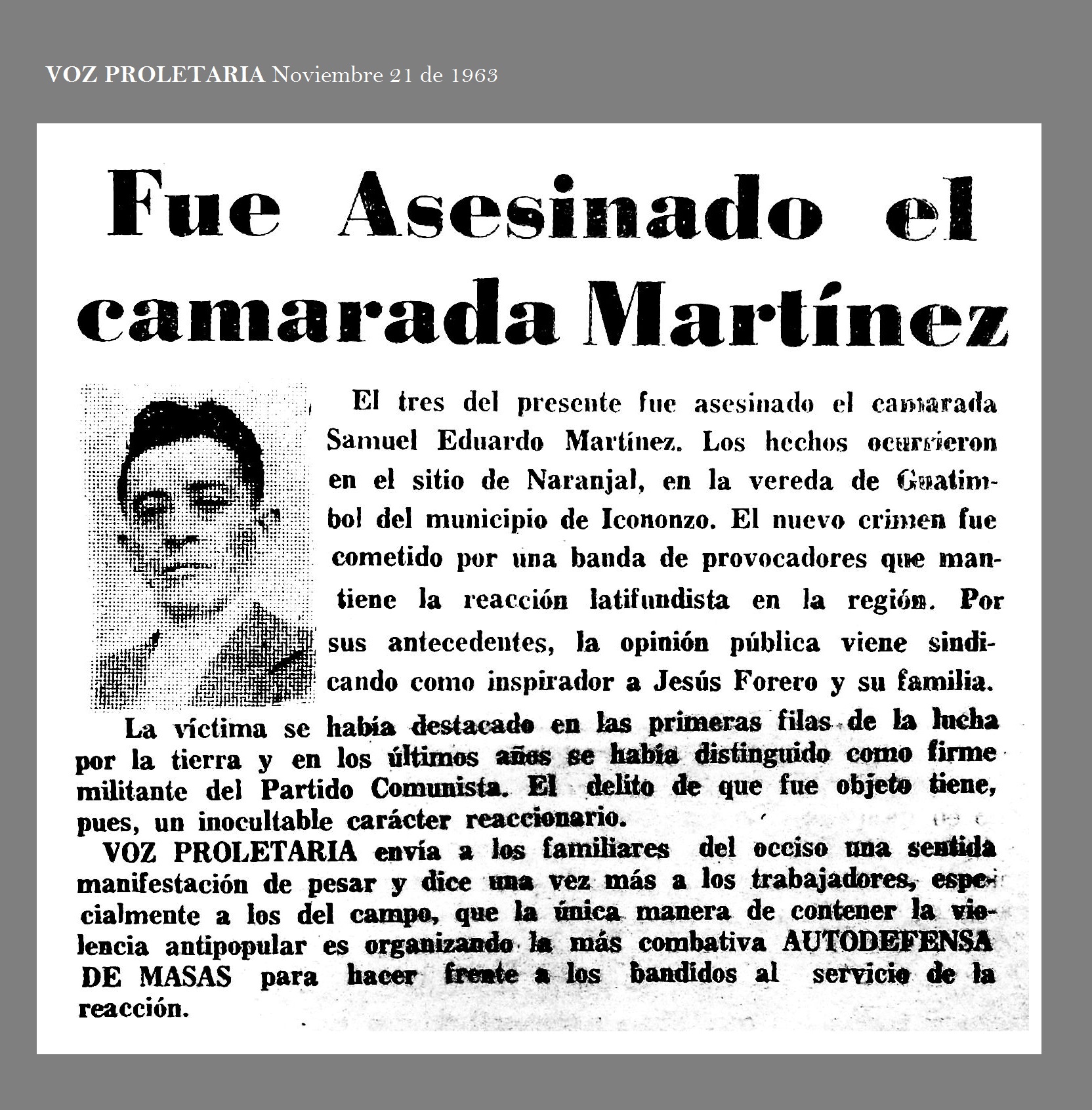 El 3 de noviembre de 1963 es asesinado el camarada SAMUEL EDUARDO MARTÍNEZ, en el sitio de Naranjal, en la vereda de Guatimbol. El crimen es cometido por una banda al servicio del latifundismo. La opinión del lugar sindicó de la inspiración del asesinato a la familia Forero. La víctima se había destacado en las primeras filas de la lucha por la tierra y en los últimos años se había destinguido como firme militante del Partido Comunista. El delito que fue objeto tiene, pues, un inocultable carácter reaccionario.