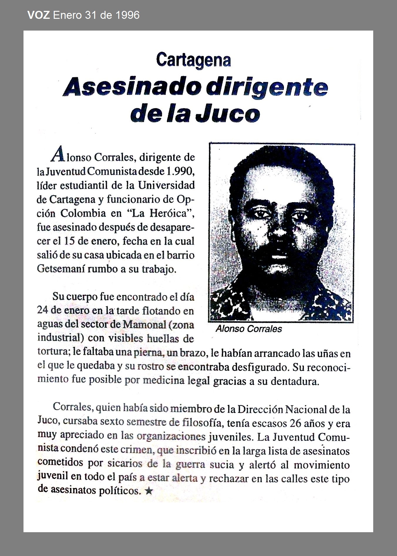 El 15 de enero de 1996 en Cartagena, Bolívar, paramilitares detuvieron y desaparecieron cuando salía de su casa ubicada en el barrio Getsemaní rumbo a su trabajo a ALONSO CORRALES HERNÁNDEZ, 26 años, estudiante de filosofía y ex integrante del Consejo Estudiantil de la Universidad de Cartagena, profesor de ciencias sociales en el colegio INESI, uno de los fundadores de la Asamblea Nacional de Estudiantes Universitarios (ANEU), ex dirigente de la JUCO, militante de la Unión Patriótica.