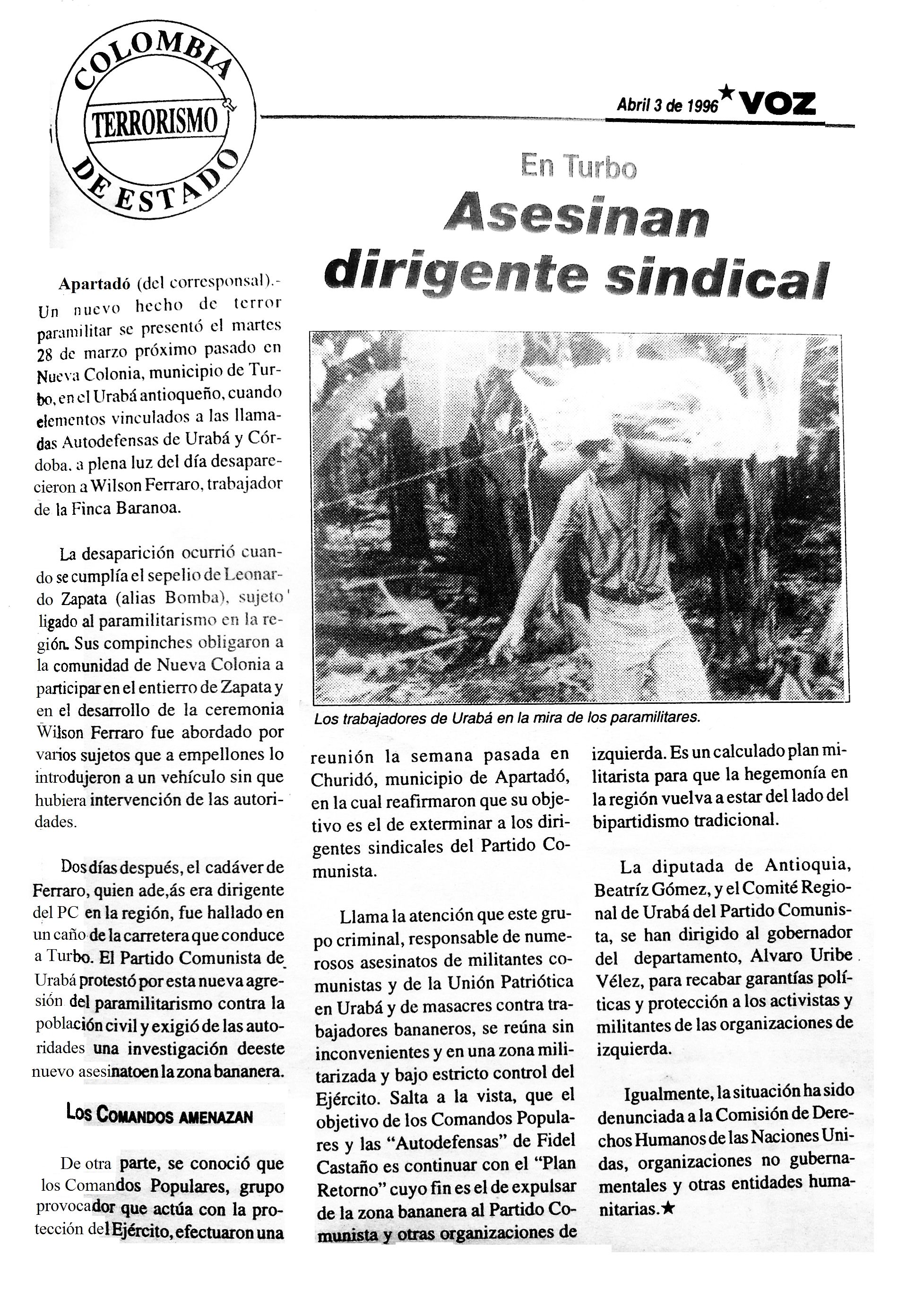 El 30 de marzo de 1996 en Turbo, Antioquia, el obrero de la finca Baranoa, ubicada en la inspección municipal Nueva Colonia, WILSON FERRARO, fue asesinado por paramilitares de las Autodefensas Campesinas de Córdoba y Urabá – ACCU. Había sido llevado a la fuerza el día 28, “a plena luz del día”, cuando se cumplía el sepelio de Leonardo Zapata, alias Bomba, sujeto ligado al paramilitarismo en la región, según indica la fuente. Los paramilitares obligaron a la comunidad de Nueva Colonia a participar al entierro de Zapata y en desarrollo de la ceremonia, subieron a Ferraro a un vehiculo “sin que hubiera intervención de las autoridades” (1). Durbey Urango, alias “Sancocho”, administrador de la finca Santa Amelia, comunal La Suerte, es sindicato de varios crímenes, entre ellos el de Wilson Ferraro (2). Era militante de la Unión Patriótica (3).