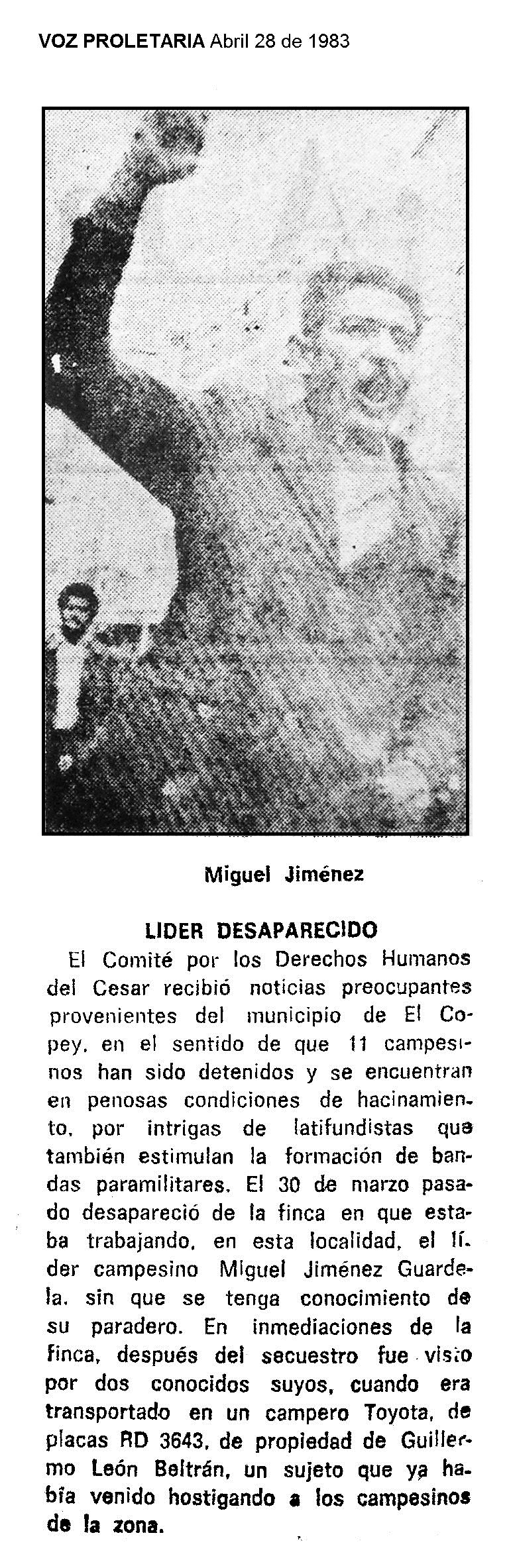 El 30 de marzo de 1983 en El Copey, Cesar, desapareció de la finca en que estaba trabajando el líder campesino MIGUEL JIMÉNEZ GUARDELA, sin que se tenga conocimiento de su paradero. En inmediaciones de la finca, después del secuestro fue visto por dos conocidos suyos, cuando era transportado en un campero Toyota de placas RD 3643, de propiedad de Guillermo Léon Beltrán, un sujeto que ya había venido hostigando a los campesinos de la zona.