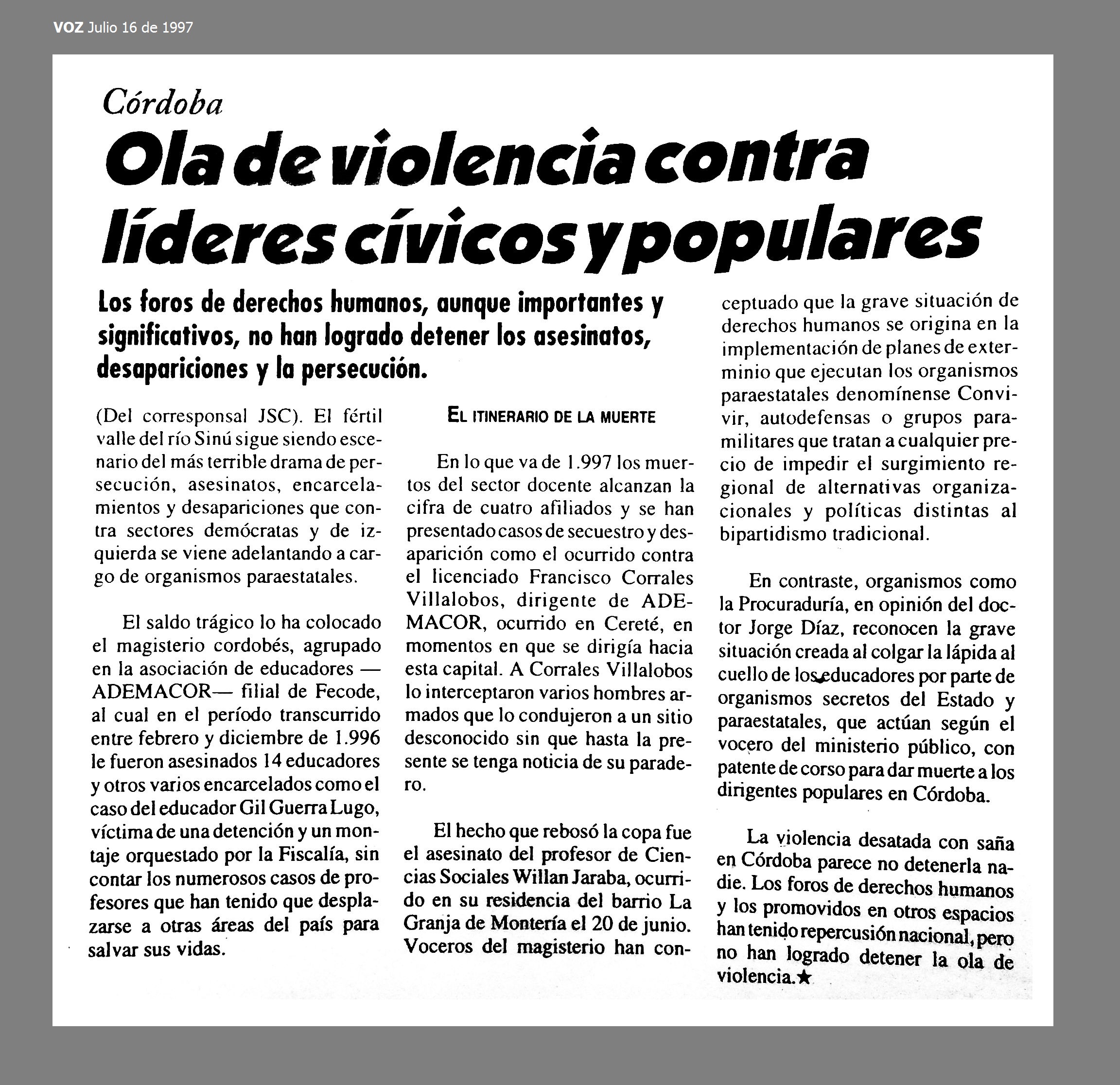 El 19 de junio de 1997 en Montería, Córdoba, paramilitares ejecutaron a WILLIAM JARABA SÁENZ, 41 años, educador de Ciencias Sociales, en hecho ocurrido en su residencia ubicada en el barrio La Granja. En los seis primeros meses de 1997, cuatro docentes han sido asesinados. Estaba afiliado a ADEMACOR Asociación de Maestros de Córdoba (1).