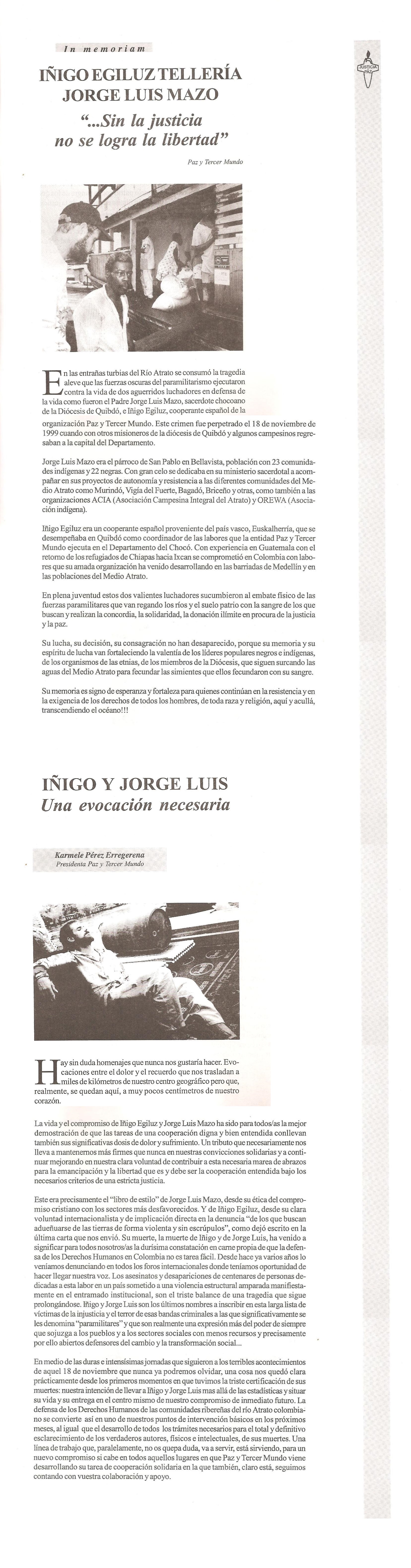 El 18 de noviembre de 1999 en Quibdó, Chocó, paramilitares bajo la etiqueta de AUC ejecutaron al Sacerdote colombiano JORGE LUIS MAZO PALACIOS, Párroco en el municipio de Bellavista - Bojayá (Chocó) y al cooperante vasco español IÑIGO EGILUZ TELLERÍA, miembro de la organización española de ayuda humanitaria Paz y Tercer Mundo, PTM, en momentos en que regresaban de atender a poblaciones desplazadas del municipio de Murindó (Antioquia) y se encontraban frente a las instalaciones de la Gobernación, en la ciudad de Quibdó.