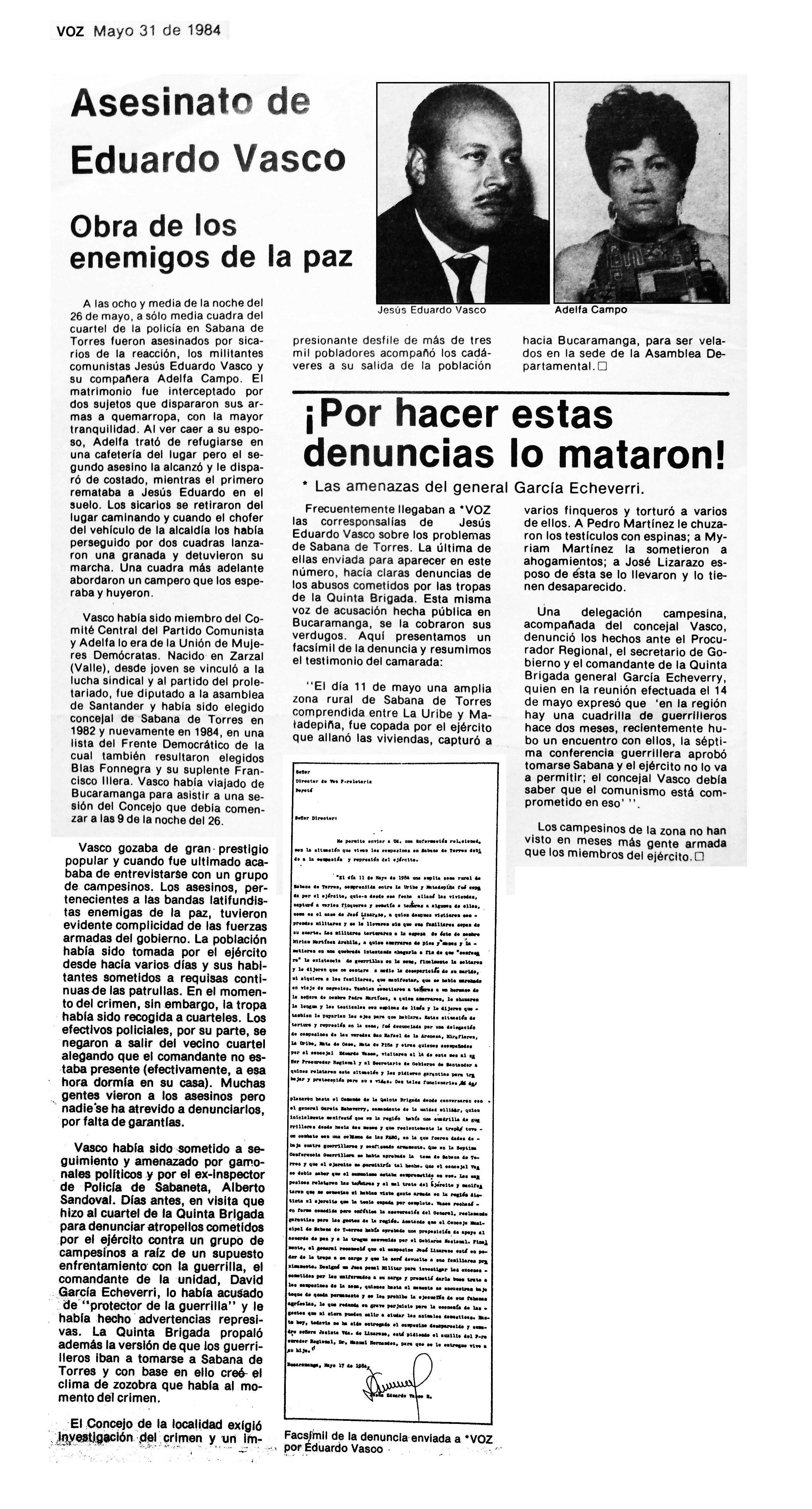 Relata la fuente: “El exterminio de los simpatizantes de las corrientes de oposición política en el municipio de Sabana de Torres comenzó el 26 de mayo de 1984 con el asesinato a manos de paramilitares del MAS del concejal comunista JESUS EDUARDO VASCO HINCAPIE y su esposa ADELFA CAMPO, quien hacía parte de la Unión de Mujeres Demócratas. Jesús Eduardo había llegado esa mañana por transporte terrestre desde Bucaramanga, ciudad donde residía y había trabajado toda la mañana como asesor jurídico. Cerca de las 3:00 de la tarde subió con su esposa por la calle principal del pueblo, entraron a una cafetería y allí los abordaron unos sicarios, quienes les dispararon y luego salieron corriendo. Los cuatro tiros que le propinaron a Jesús Eduardo y los dos que recibió Adelfa les segaron la vida en el acto. La cafetería en que fue abaleado el matrimonio Vasco Campo estaba ubicada a 25 metros del Cuartel de la Policía y media hora antes de efectuarse el crimen el ejército había hecho una redada en la que patrulló las calles y requisó a los transeúntes que caminaban por ésta misma vía. Los esposos Vasco Campo habían denunciado en varias oportunidades los abusos cometidos contra los campesinos y las amenazas de muerte de las que eran objeto por parte de grupos Paramilitares como el MAS.