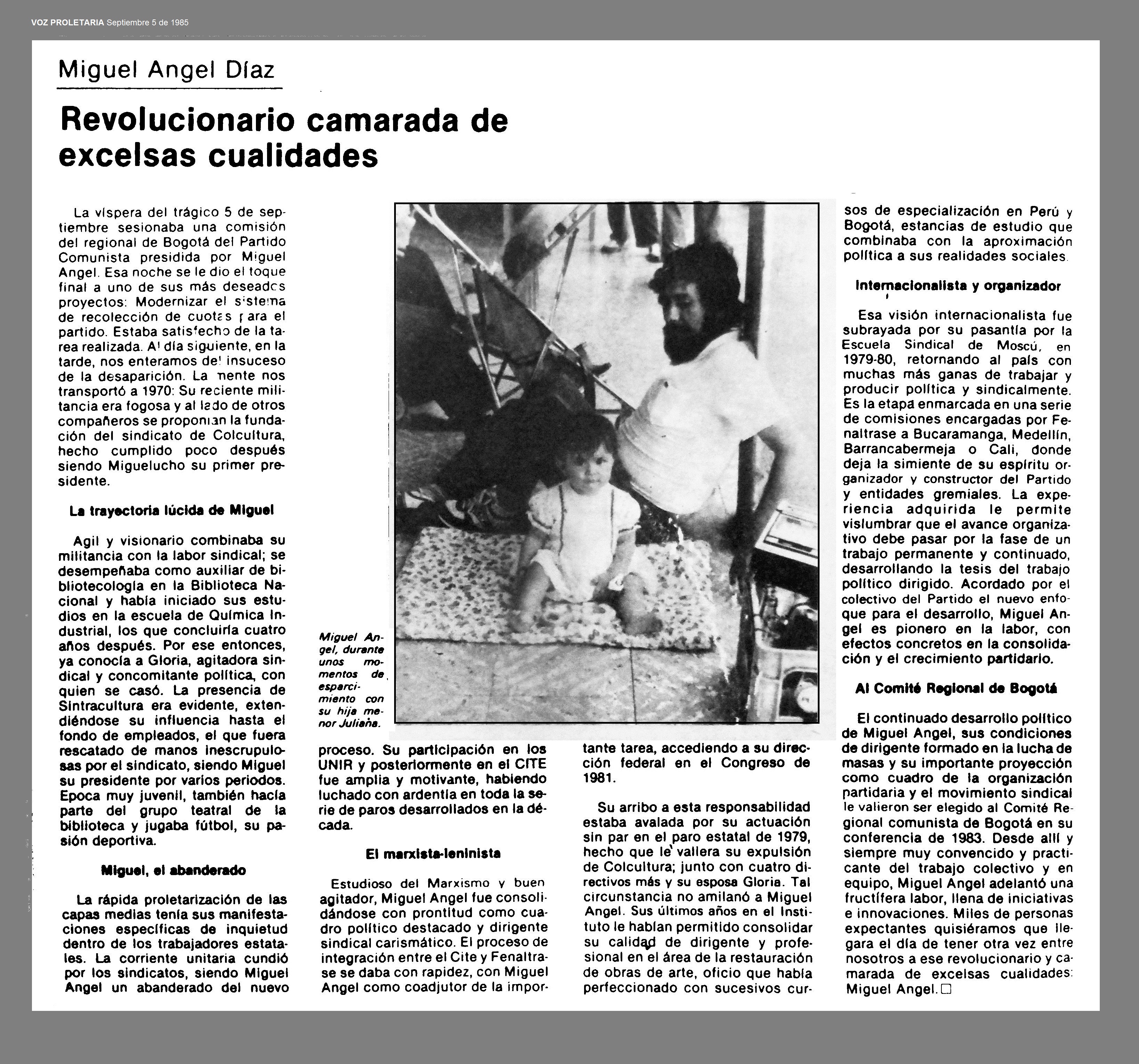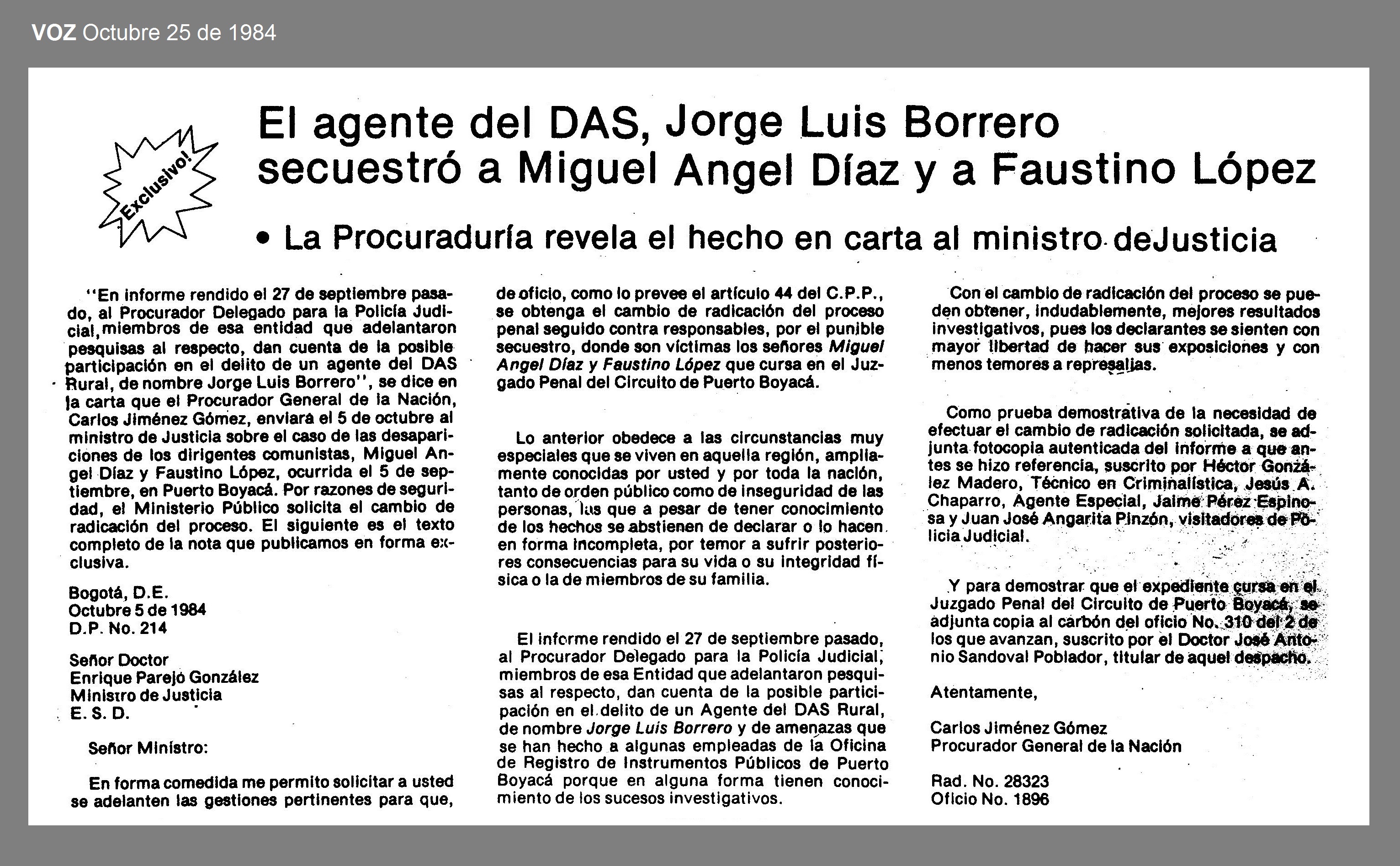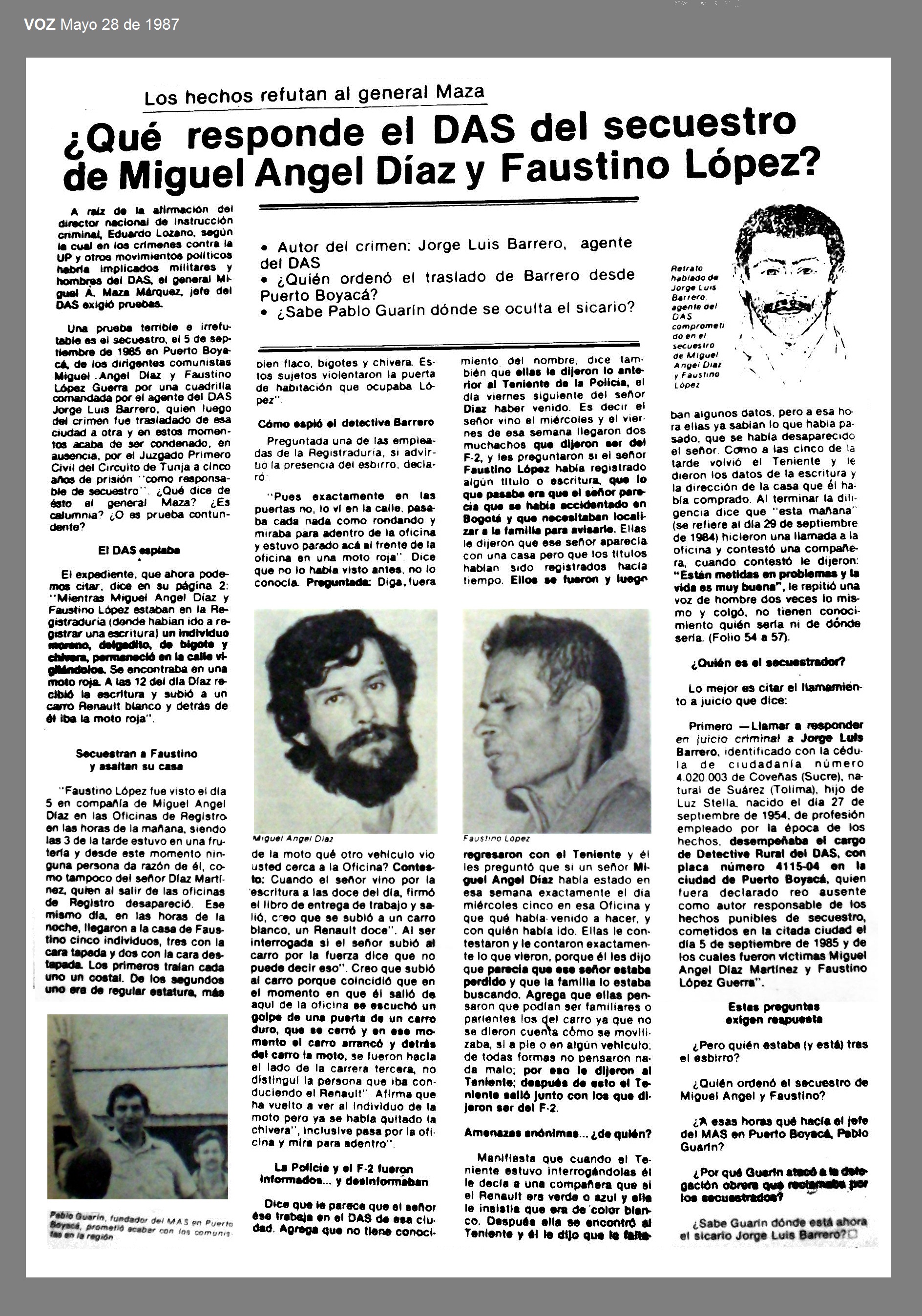 El 5 de septiembre de 1984 en Puerto Boyacá, Boyacá, los sindicalistas y miembros del Partido Comunista y de la Unión Patriótica, MIGUEL ANGEL DÍAZ MARTÍNEZ y FAUSTINO LÓPEZ GUERRERO fueron desaparecidos durante una operación conjunta entre el DAS, la Policía y paramilitares del MAS, en la que se pudo establecer participó el detective del DAS rural Jorge Luís Barrero.