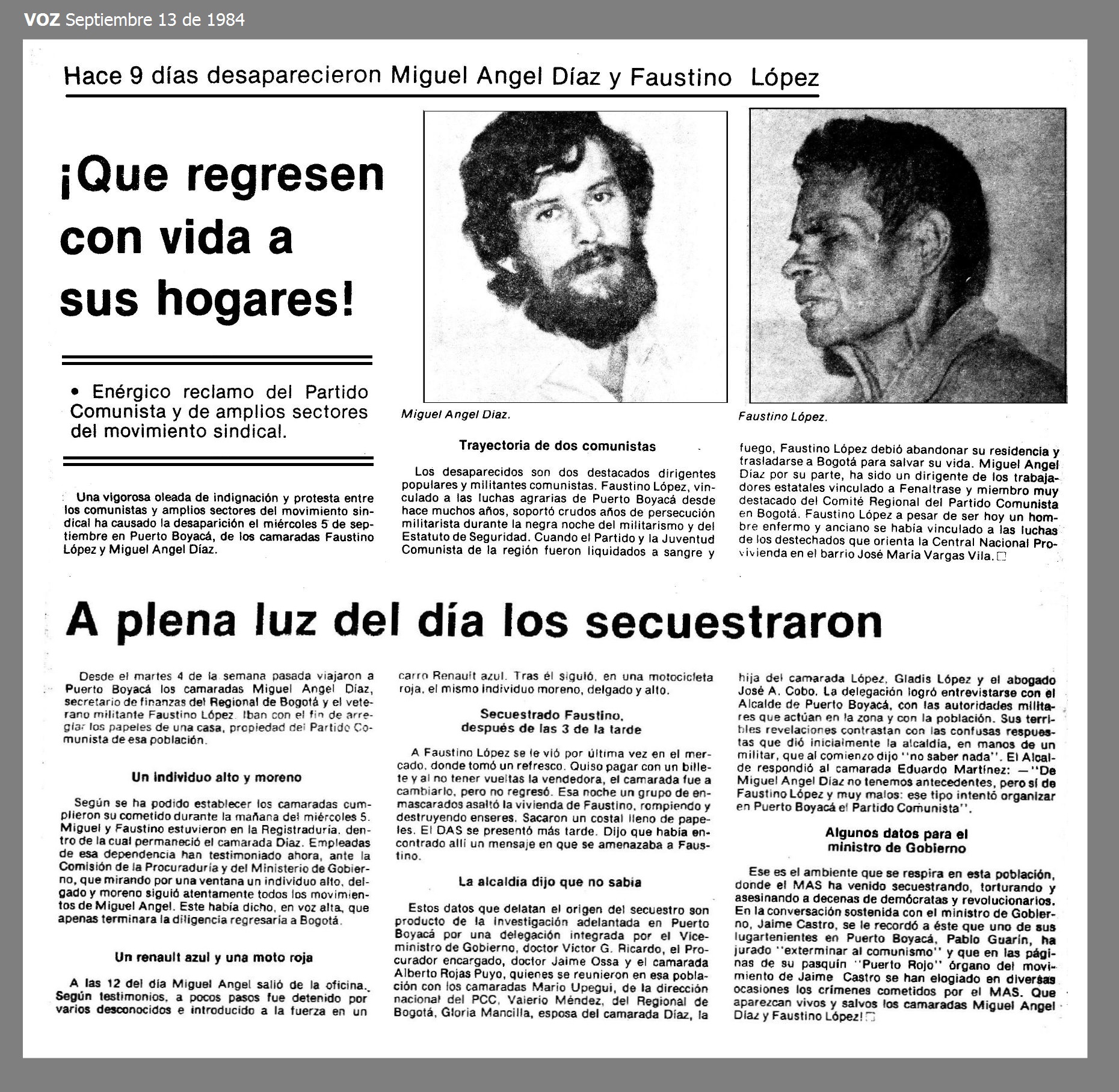 Sus cuerpos nunca fueron encontrados, pese a que tres días después algunos familiares y amigos se desplazaron a Puerto Boyacá e iniciaron las gestiones pertinentes, como averiguar con las autoridades militares y eclesiásticas, sin ningún resultado. El 15 de septiembre de 1984, una delegación de miembros de órgano sociales y políticas se desplazó desde Bogotá con el fin de presionan autoridades para que aparecieran con vida los dos desaparecidos. La delegación, de aproximadamente 150 personas que se movilizaban en tres buses, fue acompañada por delegados de la Procuraduría General de la Nación. En el sitio donde se divide la carretera para Puerto Triunfo y Puerto Boyacá fueron detenidos en un retén móvil del Ejército, que les decomisó unas pancartas que llevaban. La intervención de los delegados del gobierno posibilitó que la delegación continuara su recorrido.