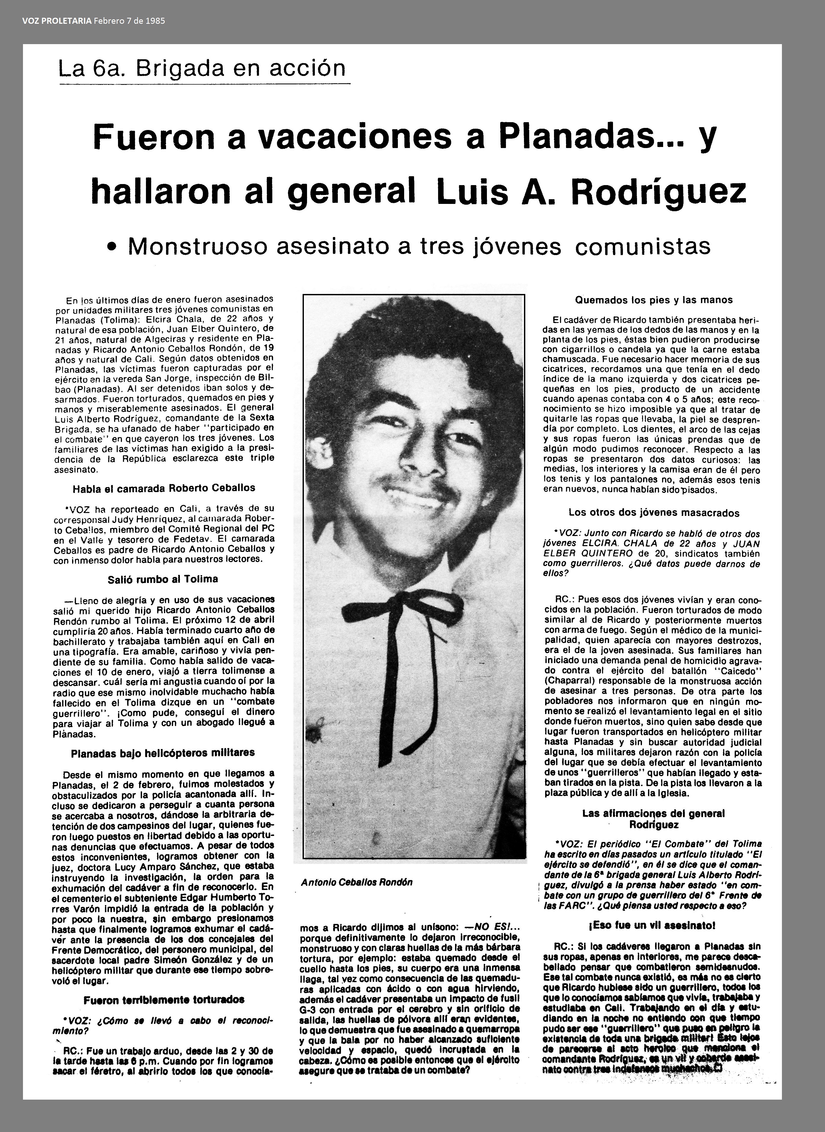 El 29 de enero de 1985 en Planadas, Tolima, fueron asesinados por unidades militares tres jóvenes comunistas: ELCIRA CHALA, de 22 años y natural de esa población, JUAN ELBER QUINTERO, de 21 años, natural de Algeciras y residente en Planadas y RICARDO ANTONIO CEBALLOS RENDÓN, de 19 años y natural de Cali. Según datos obtenidos en Planadas, las víctimas fueron capturadas por el ejército en la vereda San Jorge, inspección de Bilbao. Al ser detenidos iban solos y desarmados. Fueron torturados, quemados en pies y manos y miserablemente asesinados. El General Luis Alberto Rodríguez, comandante de la Sexta Brigada, se ha ufanado de haber “participado en el combate” en que cayeron los tres jóvenes. Los familiares de las víctimas han exigido a la Presidencia de la República esclarezca este triple asesinato. Ricardo Antonio Ceballos Rendón era hijo de Roberto Ceballos, miembro del Comité Regional del PC en el Valle y Tesorero de Fedetav (1).