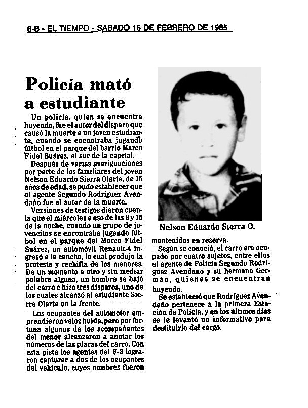 El 13 de febrero de 1985 en Bogotá, D.E., cuando jugaba fútbol en el parque del barrio Marco Fidel Suárez, el joven NELSON EDUARDO SIERRA OLARTE, de 15 años de edad, es ultimado por el agente de la policía Segundo Rodríguez Avendaño de un disparo en la cabeza. El agente estaba acompañado de otras personas y se movilizaban en un carro.
