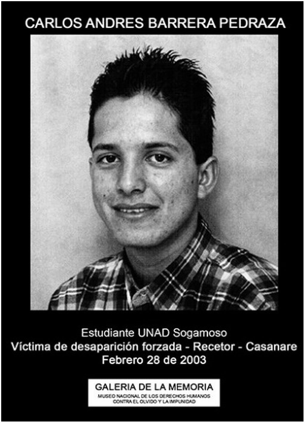 El 28 de febrero de 2003 en Recetor, Casanare, el estudiante de Zootecnia en la UNAL de Sogamoso, CARLOS ANDRÉS BARRERA PEDRAZA, quien había sido beneficiario de una pasantía otorgada por el Alcalde de Recetor para poderse graduar, contemplando su contrato de servicios la revisión de un ganado relacionado con el fondo de crédito municipal, ganado que estaba en la vereda El Vegón, salió a revisar el ganado junto con su amigo JAVIER MARTÍNEZ DÍAZ, de 33 años, y el niño de éste, de 6 años de edad, los paramilitares los retuvieron en la vereda El Vegón y sólo después de tres días dejaron salir al niño de Javier Martínez, quien narró las torturas a que lo sometían por llorar y preguntar por su papá. Ocho días después, la madre de Carlos Andrés fue hasta la vereda a preguntar por su hijo. Un paramilitar de tez negra, quien la atendió, luego de consultar con sus comandantes, le respondió que sí lo tenían en su poder pero lo habían enviado para el Meta. Nunca más se tuvo noticias de su paradero.