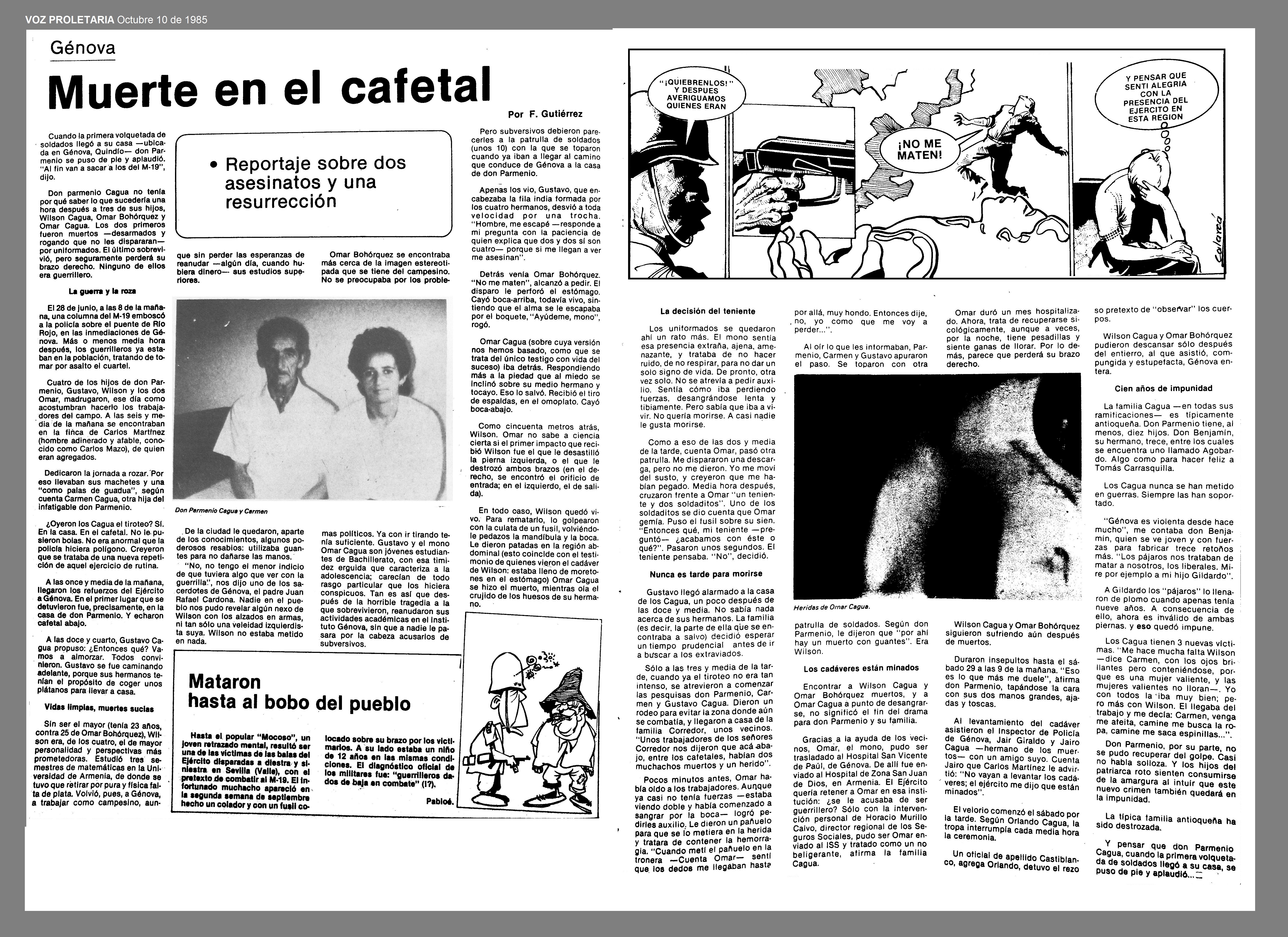Omar Bohorquez Omar Bohorquez Fuente: Edad: Sin información Género: M Profesión: 1. Campesino Fecha: 1985-06-28 Tipo Victima: Asesinato Departamento: Quindío Municipio: Génova Presuntos responsables: 1. Ejército Hechos El 28 de junio de 1985 en Génova, Quindío, miembros del ejército asesinaron a los hermanos WILSON CAGUA y OMAR BOHORQUEZ, e hirieron a Omar Cagua, hermano de los dos primeros. Fuentes: 1. VOZ PROLETARIA Octubre 10 de 1985 Información Relacionada 1. VOZ - MUERTE EN EL CAFETAL.JPG Otras víctimas Wilson Cagua To top