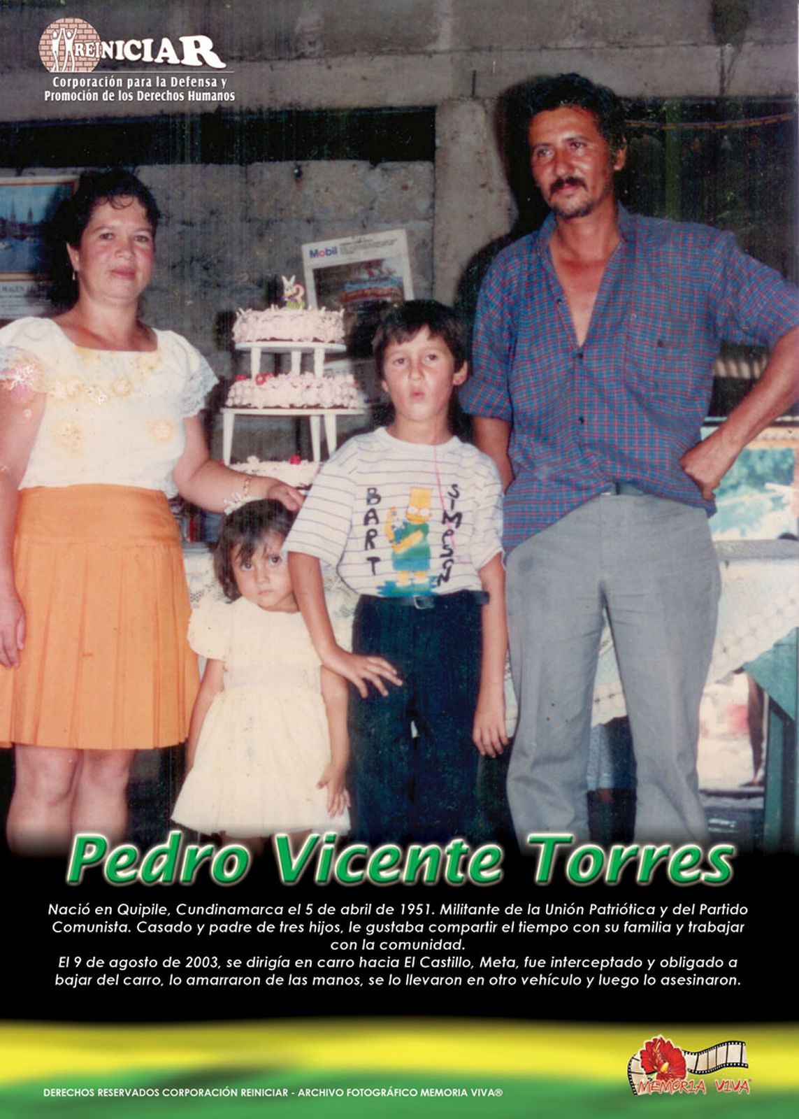 Pedro Vicente Torres nació en Quiple, Cundinamarca el 5 de abril de 1951. Militante de la Unión Patriótica y del Partido Comunista. Casado y padre de tres hijos, le gustaba compartir el tiempo con su familia y trabajar con la comunidad. El 9 de agosto de 2003 se dirigía en carro hacia El Castillo, Meta, fue interceptado y obligado a bajar del carro, lo amarraron de las manos, se lo llevaron en otro vehículo y luego lo asesinaron (2).