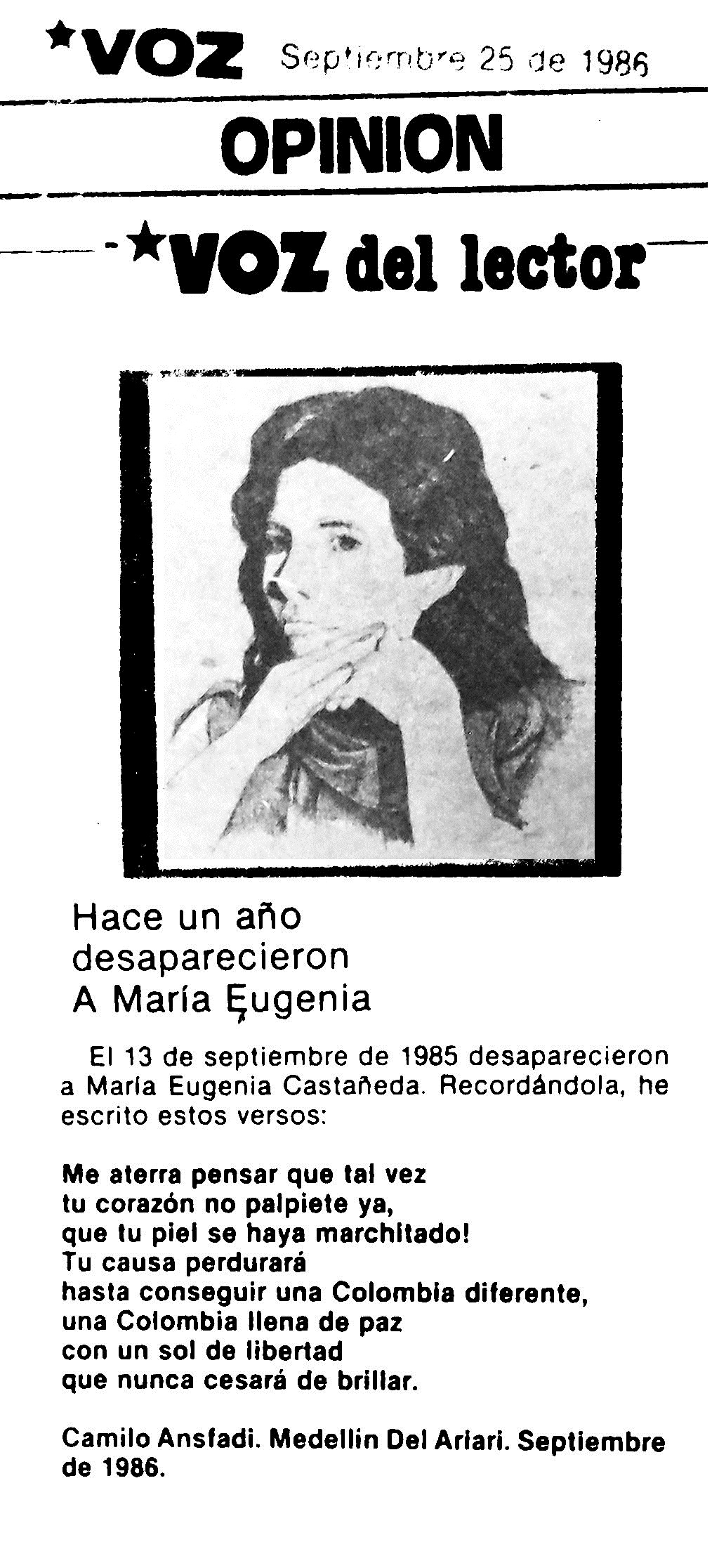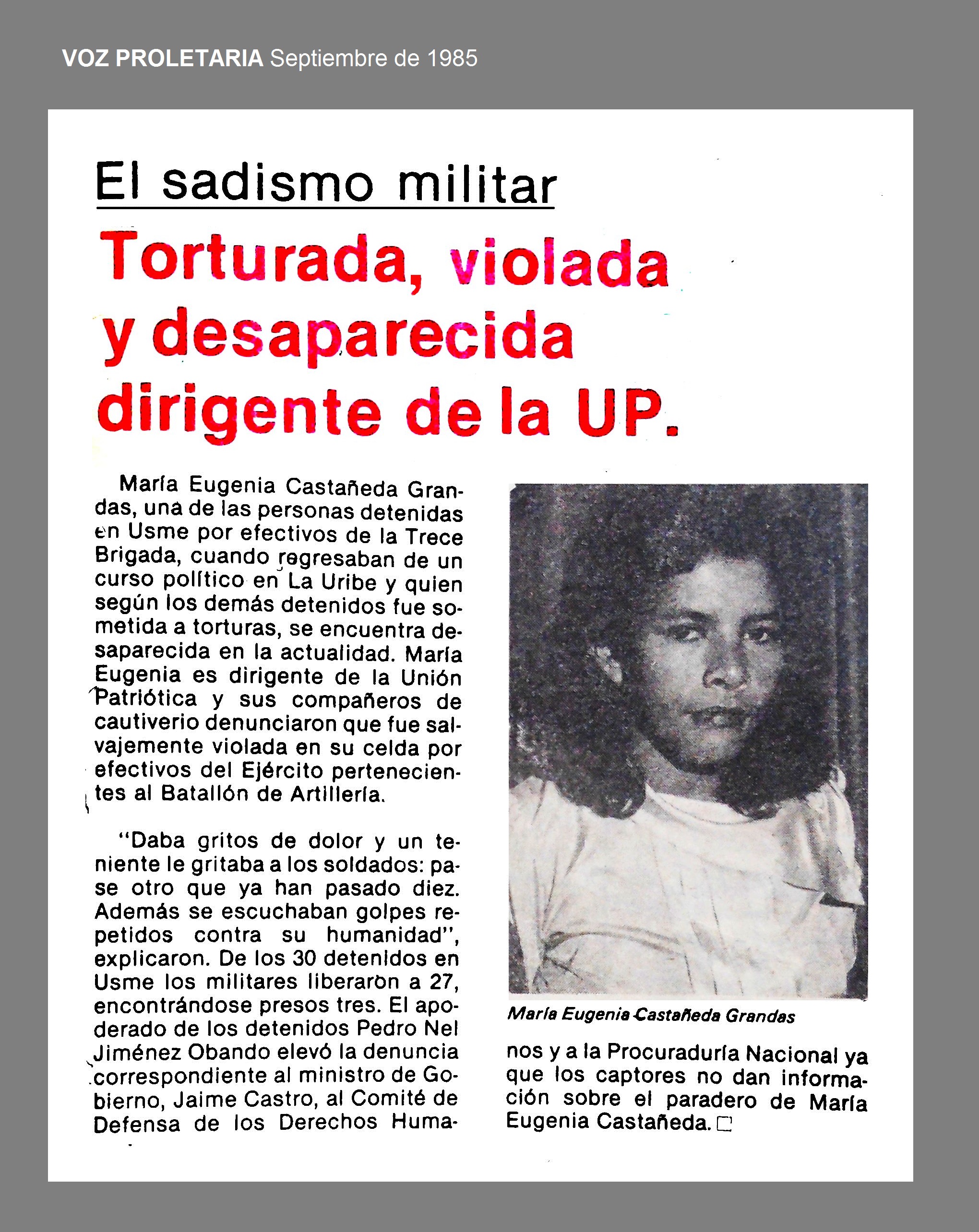 En el marco del primer congreso nacional de la Unión Patriótica, se produjo la resolución número 001, mediante la cual se denuncia la detención y desaparición de la compañera María Eugenia Castañeda Granda por el batallón de Artillería. De allí, fue trasladada a la sexta brigada, en las dependencias del batallón Jaime Rooke. Señala la resolución que al indagar allí por la dirigente política, la respuesta fue que había sido puesta en libertad el 17 de septiembre de 1985, pero testimonios afirman que la vieron con el ejército los días 20, 24 y 2 de octubre.