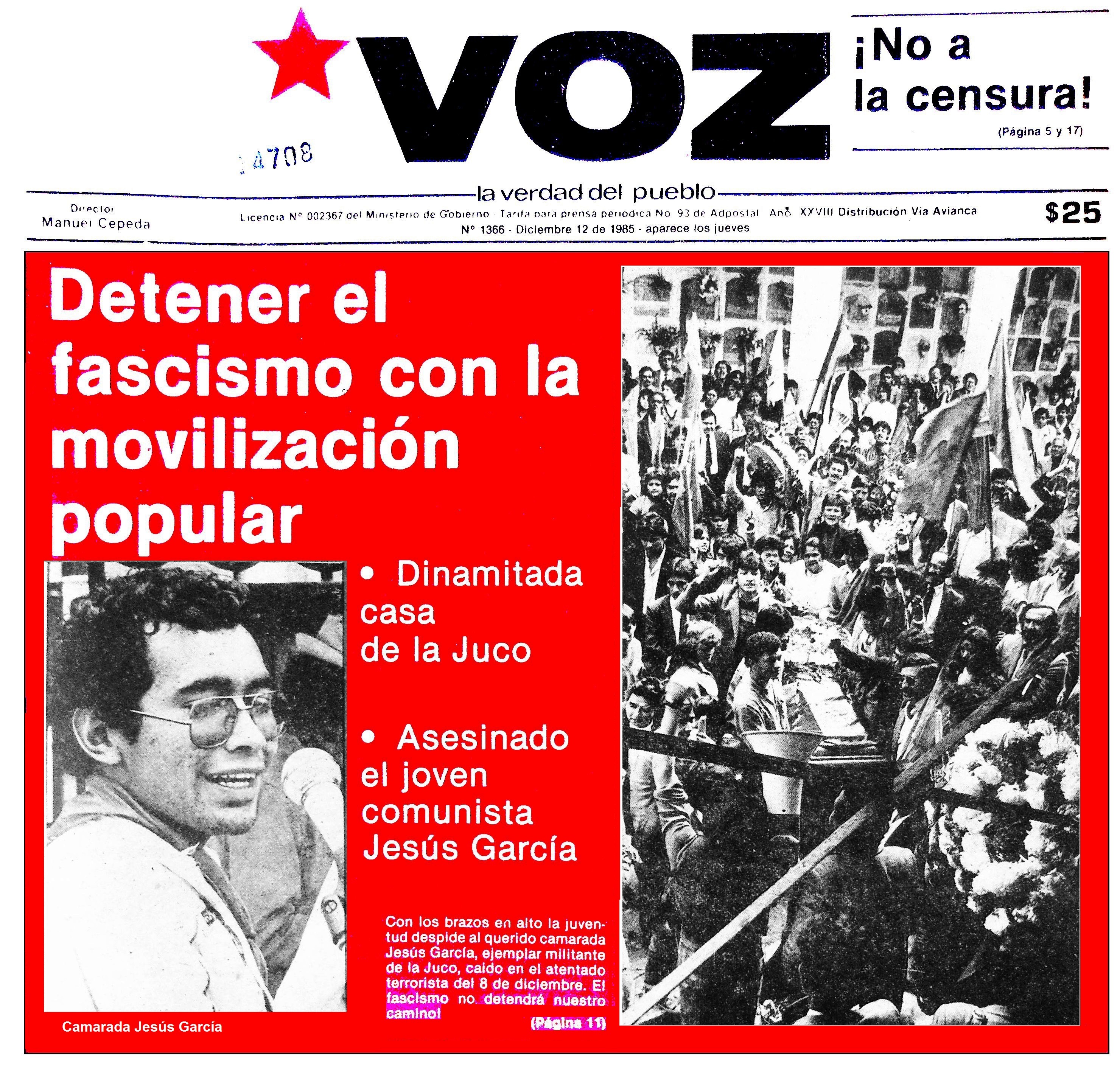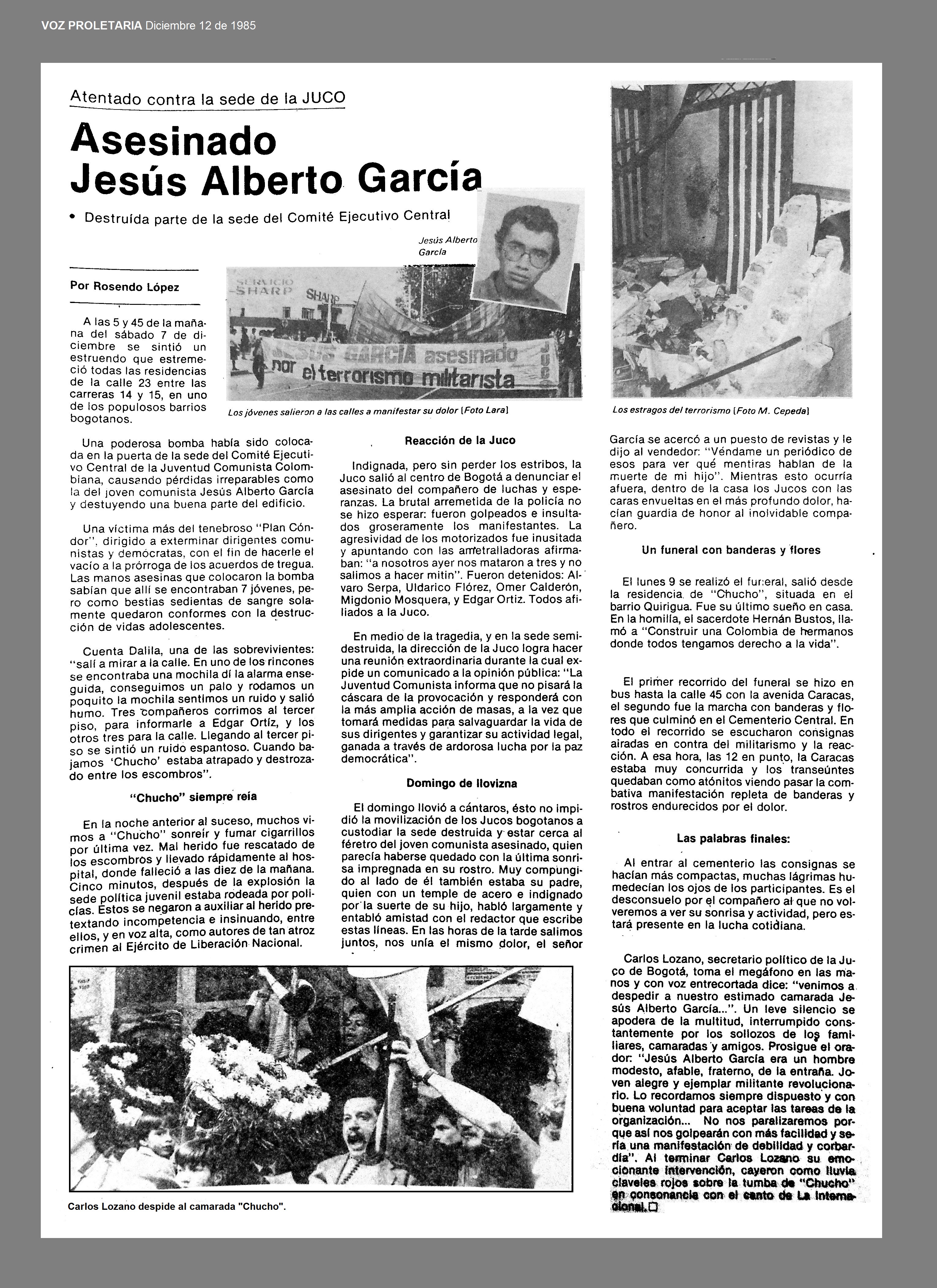 El 7 de diciembre de 1985 en Bogotá, D.C., a las 5 y 45 de la mañana se sintió un estruendo que estremeció todas las residencias de la calle 23 entre las carreras 14 y 15 en uno de los populosos barrios de la ciudad. Una poderosa bomba había sido colocada en la puerta de la sede del Comité Ejecutivo Central de la Juventud Comunista Colombiana, causando perdidas irreparables como la del joven comunista JESUS ALBERTO GARCIA y destruyendo una buena parte del edificio (1).