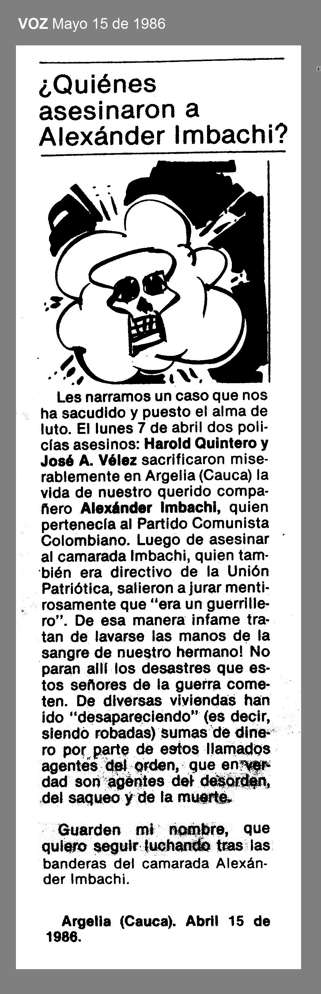 Alejandro Imbachi Alejandro Imbachi Fuente: Edad: Sin información Género: M Profesión: 1. Campesino Afiliación política: 1. UP Unión Patriótica Fecha: 1986-04-07 Tipo Victima: Asesinato Departamento: Cauca Municipio: Argelia Vereda: Los Mangos Lugar: Presuntos responsables: 1. Policía Nacional Hechos El 7 de abril de 1986 en Argelia, Cauca, miembros de la Policía asesinaron a ALEJANDRO IMBACHI, campesino militante de la Unión Patriótica, en la vereda Los Mangos. Fuentes: 1. ROBERTO ROMERO OSPINA Unión Patriótica: Expedientes contra el olvido Enlaces 1. CONTRAVÍA: In memoriam - Exterminio de la Unión Patriótica (Parte I) - 2. CONTRAVÍA: In memoriam - Exterminio de la Unión Patriótica (Parte II) - 3. CONTRAVÍA: In memoriam - Exterminio de la Unión Patriótica (Parte III) - 4. SEMANA.COM Documental: El exterminio de la Unión Patriótica - Información Relacionada 1. VOZ - QUIENES ASESINARON A ALEXANDER IMBACHI.JPG 2. CINEP PPP - 23 AÑOS DE FALSOS POSITIVOS 1988-2011.pdf 3. EL GENOCIDIO DE LA UNIÓN PATRIÓTICA.pdf To top