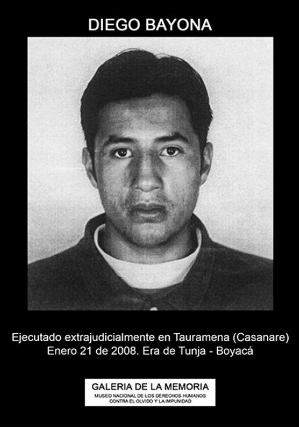 El 21 de enero de 2008 en Tauramena, Casanare, militares del Ejército Nacional ejecutaron a ÓSCAR DANIEL ESPÍTIA y DIEGO BAYONA GUTIÉRREZ. Según la denuncia: “Desde julio de 2007 Diego se había trasladado desde el municipio de Tunja (Boyacá), su ciudad natal, hacia Yopal (Casanare) para trabajar con un sobrino en un montallantas. Luego en diciembre de ese mismo año, se fue de ese municipio porque iba a buscar un mejor trabajo al municipio de Villavicencio (Meta) en una chatarrería, pero desde ese momento su familia no supo nada más de él, y permaneció desaparecido durante más de dos años, ya que solo en abril de 2010, su familia tuvo noticias cuando la Fiscalía les informó que Diego junto con otra persona habían sido muertos en un combate sostenido con el Ejército en enero de 2008, en una vereda de Tauramena. Diego fue sepultado como NN en el cementerio de Tauramena y en mayo de 2010, sus restos fueron reconocidos por su familia por medio de unas fotos de su cuerpo donde tenía un tatuaje y la ropa de civil que él usaba. Diego era un joven de 22 años de edad y nunca había usado armas en su vida”.