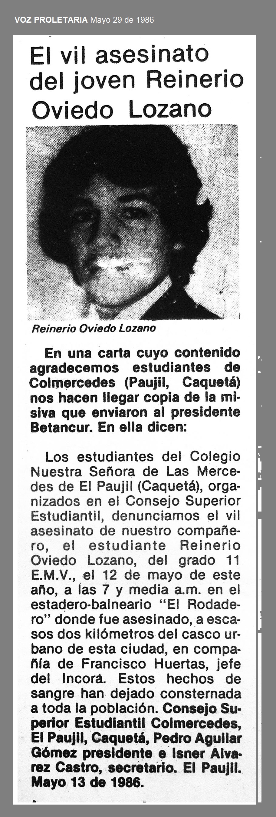 El 12 de mayo de 1986 en El Paujil, Caquetá, a las 7 y media a.m en el estadero balneario “El Rodadero” fueron asesinados REINERIO OVIEDO LOZANO, estudiante del grado 11 del Colegio Nuestra Señora de Las Mercedes y FRANCISCO HUERTAS, jefe del Incora. Estos hechos de sangre han dejado consternada a toda la población (1). FRANCISCO HUERTAS HERRERA y REINEIRO OVIEDO eran dirigentes de la Unión Patriótica (2).