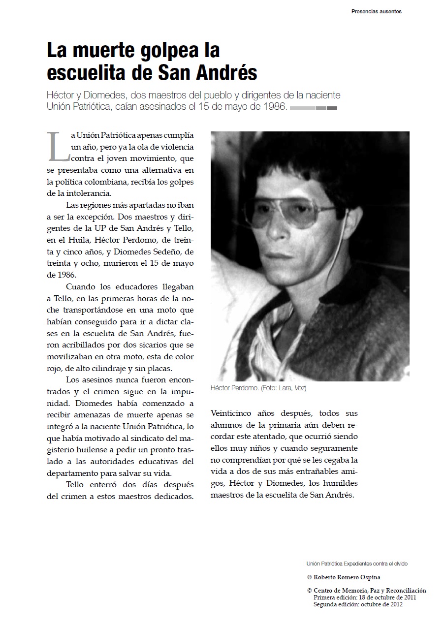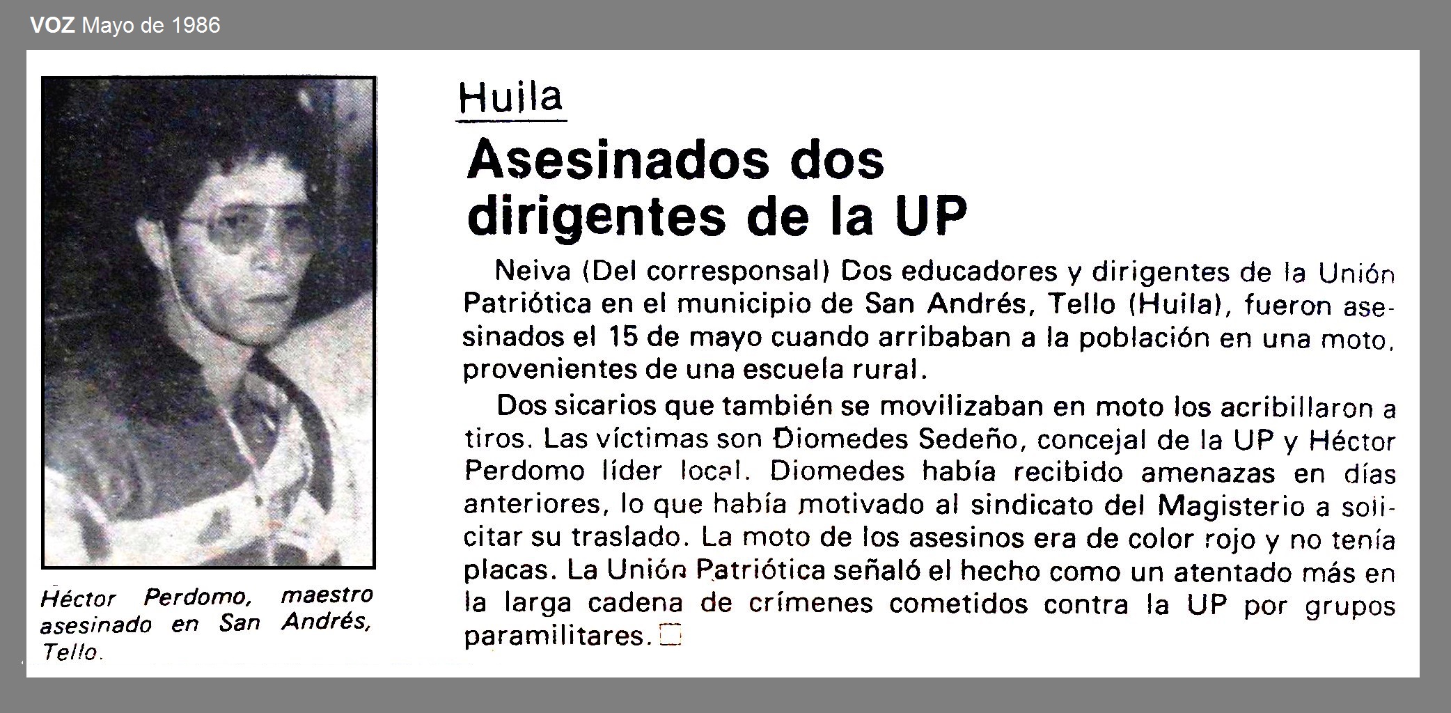 El 15 de mayo de 1986 en Tello, Huila, los líderes, docentes, sindicalistas y dirigentes de la Unión Patriótica, JOSÉ DIOMEDES CEDEÑO, 38 años, concejal de la localidad y HÉCTOR PERDOMO SOTO, de 37 años, fueron asesinados por policías vestidos de civil.