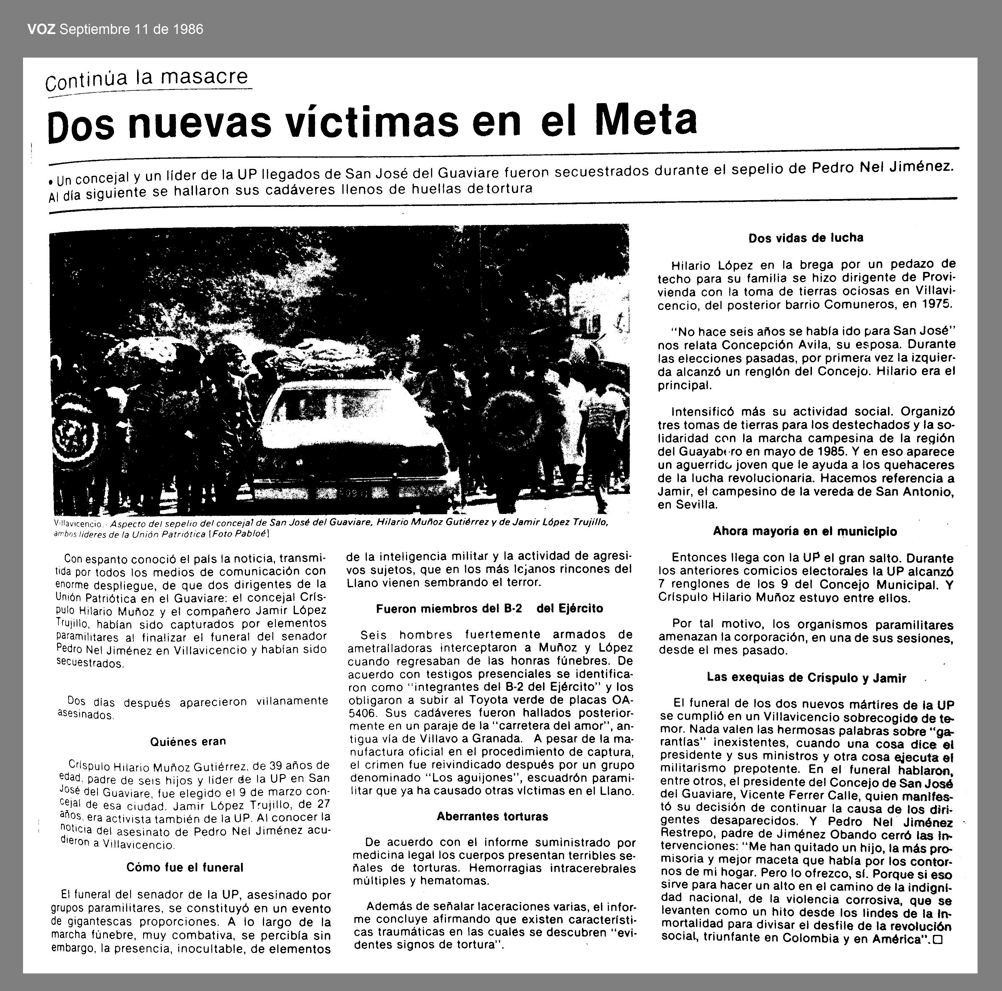 El 3 de septiembre de 1986 en Villavicencio, Meta, seis hombres fuertemente armados de ametralladoras interceptaron cuando regresaban de las honras fúnebres del senador Pedro Nel Jiménez Obando, a los dirigentes de la Unión Patriótica del Guaviare, JAMIR LÓPEZ TRUJILLO y CRISPULO HILARIO MUÑOZ GUTIÉRREZ. De acuerdo con testigos presenciales se identificaron como "integrantes del B-2 del Ejército", y los obligaron a subir a un Toyota verde de placas OA5406. Sus cadáveres fueron hallados posteriormente en un paraje de la "carretera del amor", antigua vía de Villavo a Granada. De acuerdo con el informe suministrado por medicina legal presentaban terribles señales de torturas, hemorragias intracerebrales múltiples y hematomas.