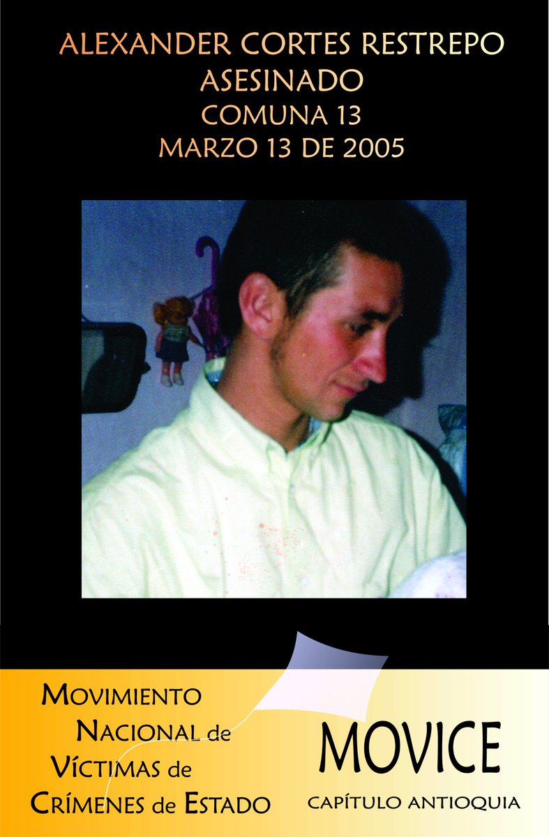 Alexander Cortés Restrepo Alexander Cortés Restrepo Fuente: MOVICE Movimiento de Victimas de Crímenes de Estado Edad: Sin información Género: M Fecha: 2005-03-13 Tipo Victima: Asesinato Departamento: Antioquia Municipio: Medellín Lugar: Comuna 13 Presuntos responsables: 1. Sin información Hechos El 13 de marzo de 2005 en Medellín, Antioquia, fue asesinado ALEXANDER CORTÉS RESTREPO, en la Comuna 13. Fuentes: 1. MOVICE Movimiento de Victimas de Crímenes de Estado Información Relacionada 1. ALEXANDER CORTES RESTREPO 13MAR05.jpg To top