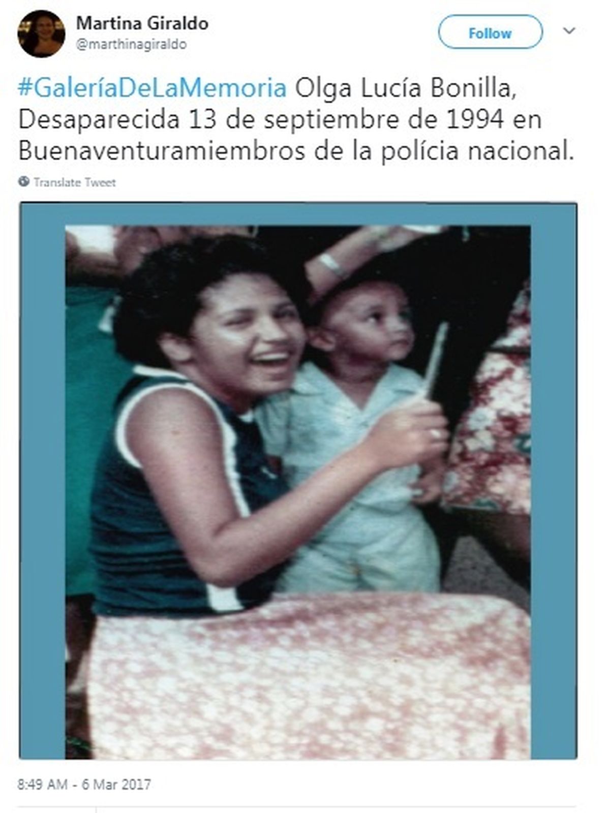 Olga Lucía Bonilla Olga Lucía Bonilla Fuente: Martina Giraldo Edad: Sin información Género: F Fecha: 1994-09-13 Tipo Victima: Desaparición forzada Departamento: Valle del Cauca Municipio: Buenaventura Presuntos responsables: 1. Policía Nacional Hechos El 13 de septiembre de 1994 en Buenaventura, Valle del Cauca, miembros de la policía detuvieron y desaparecieron a OLGA LUCÍA BONILLA. ¿Dónde Está? Fuentes: 1. Martina Giraldo @marthinagiraldo Información Relacionada 1. OLGA LUCIA BONILLA.jpg To top