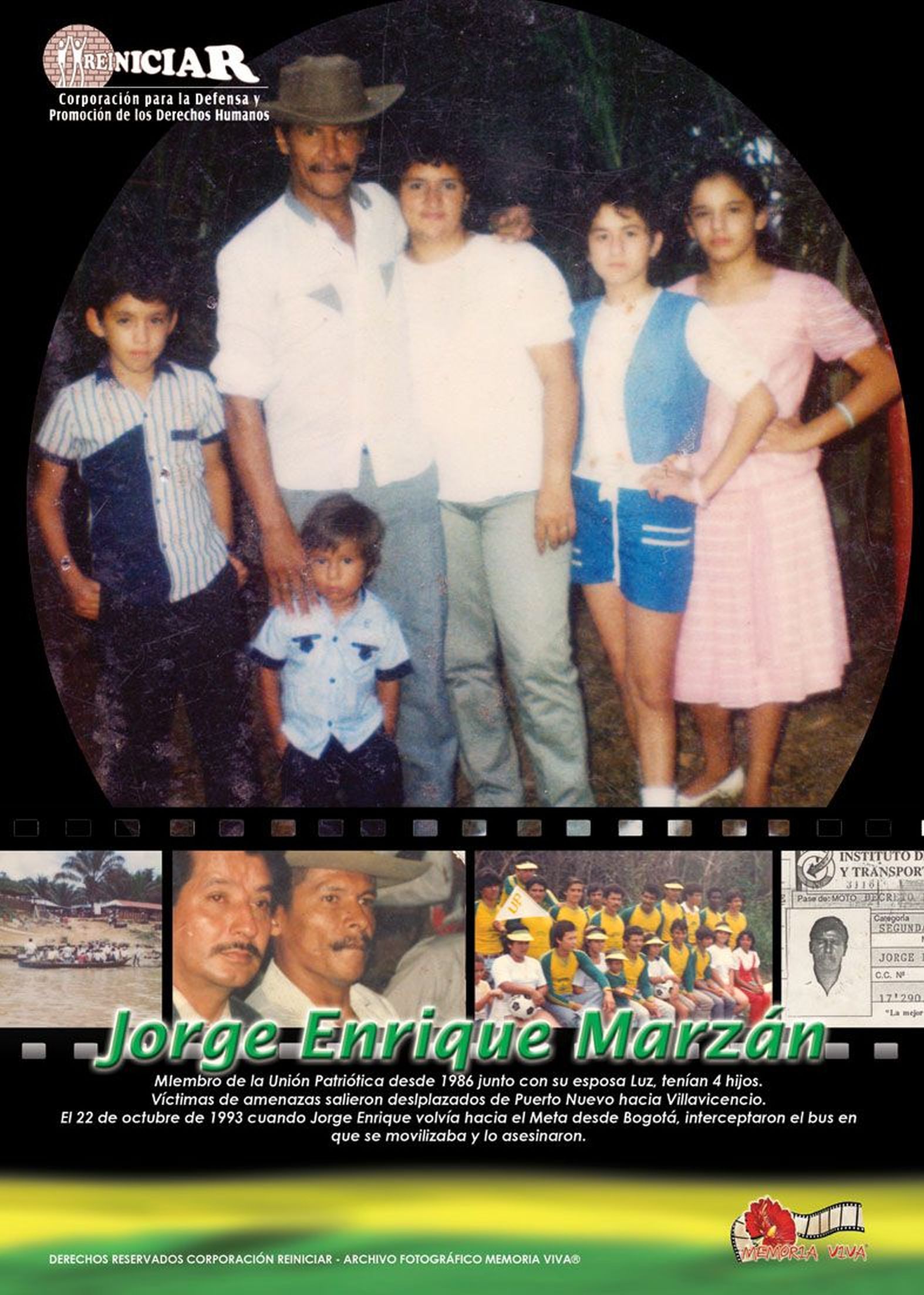 El 22 de octubre de 1993 cuando JORGE ENRIQUE MARZÁN volvía hacia el Meta desde Bogotá, interceptaron el bus en que se movilizaba y lo asesinaron. Era miembro de la Unión Patriótica desde 1986 junto con su esposa Luz, tenían 4 hijos. Víctimas de amenazas salieron desplazados de Puerto Nuevo hacia Villavicencio.