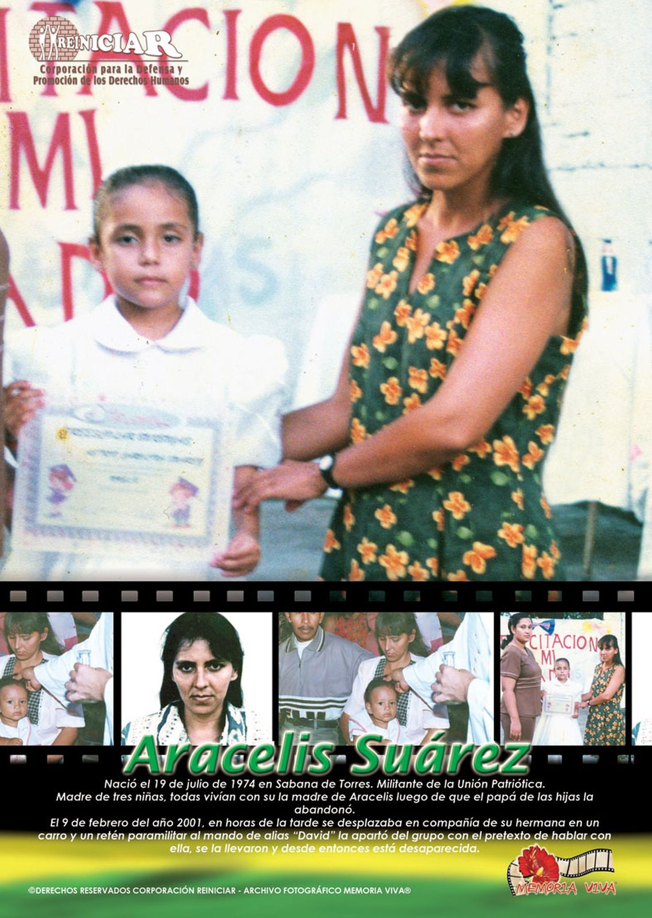 El 9 de febrero de 2001 en Sabana de Torres, Santander, en horas de la tarde, la militante de la Unión Patriótica, ARACELIS SUÁREZ CONTRERAS, se desplazaba en compañía de su hermana en un carro y en un retén paramilitar al mando de alias "David" la apartó del grupo con el pretexto de hablar con ella, se la llevaron y desde ese entonces está desaparecida. Aracelis nació el 19 de julio de 1974 en Sabana de Torres. Madre de tres niñas, todas vivían con la madre de Aracelis luego de que el papá de las hijas las abandonó.
