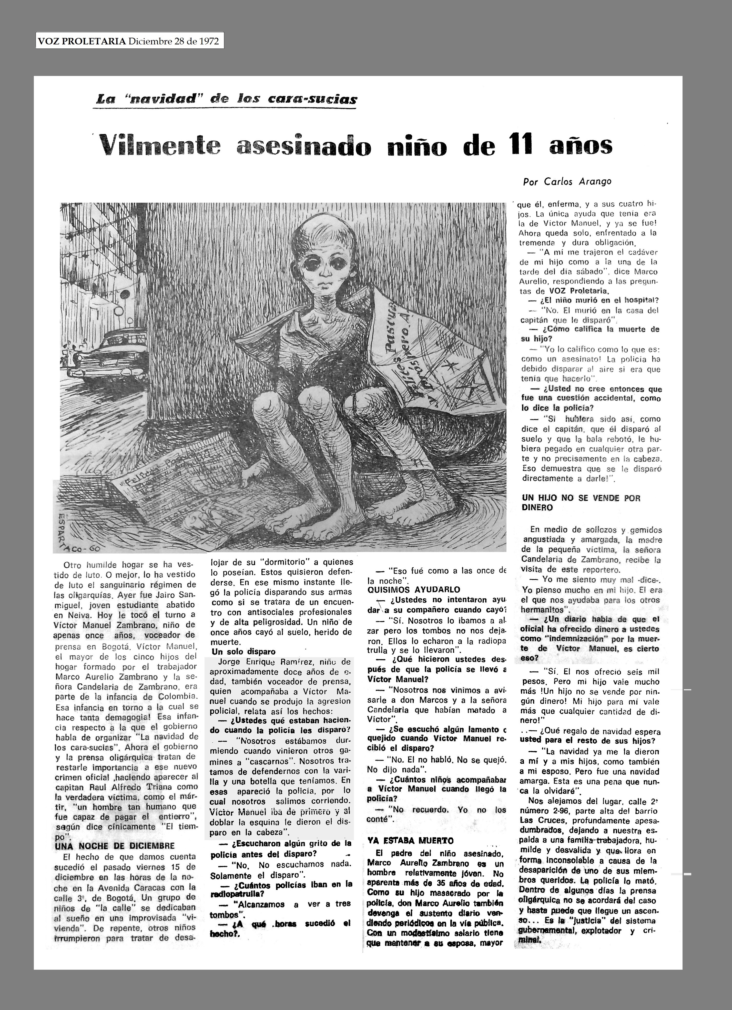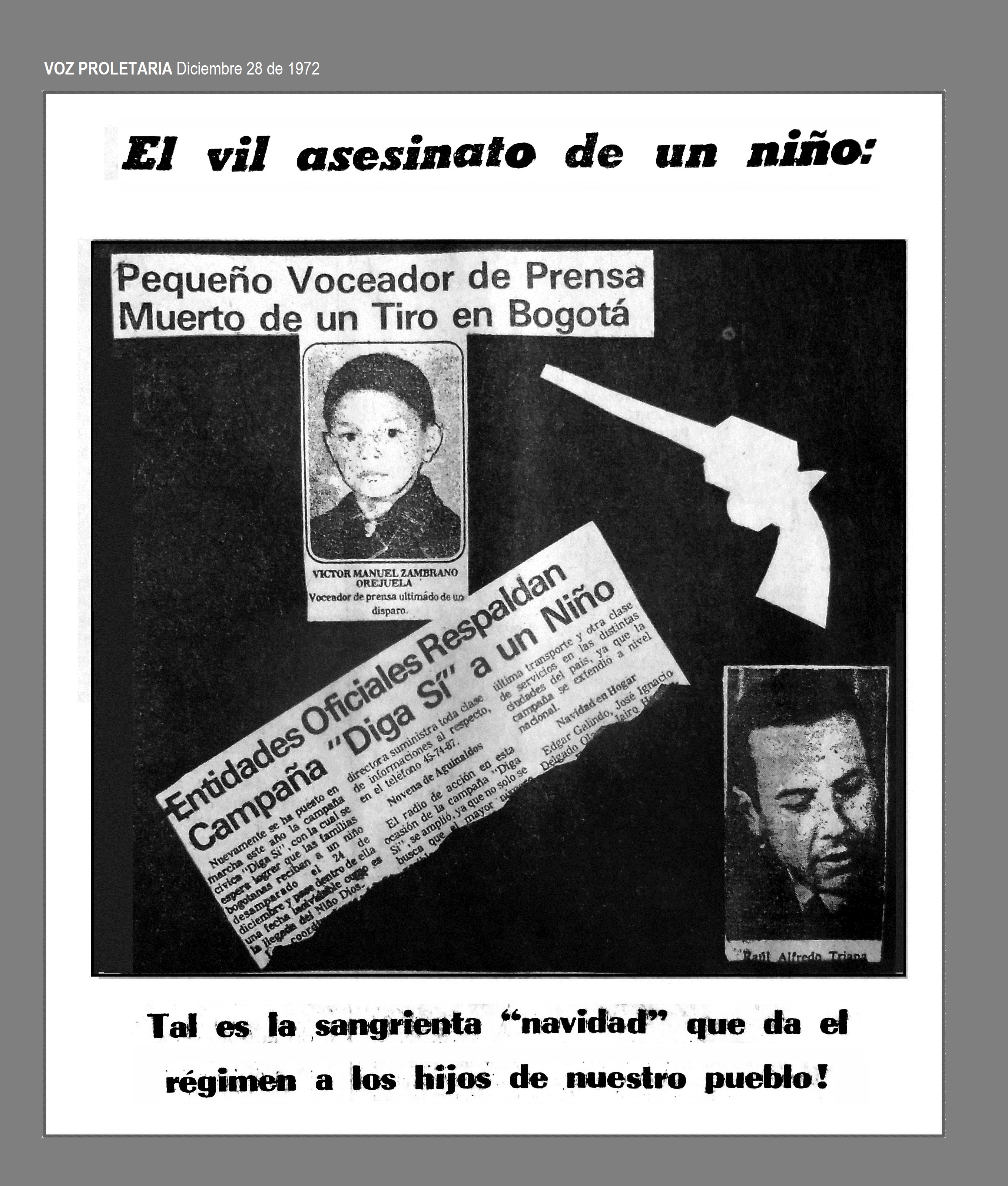El 15 de diciembre de 1972 en Bogotá, D.E., en horas de la noche, el capitán de la Policía Raúl Alfredo Triana asesinó de un tiro en la cabeza a VICTOR MANUEL ZAMBRANO ORJUELA, niño de once años, voceador de prensa. El hecho ocurrió en la Avenida Caracas con la calle 3a.