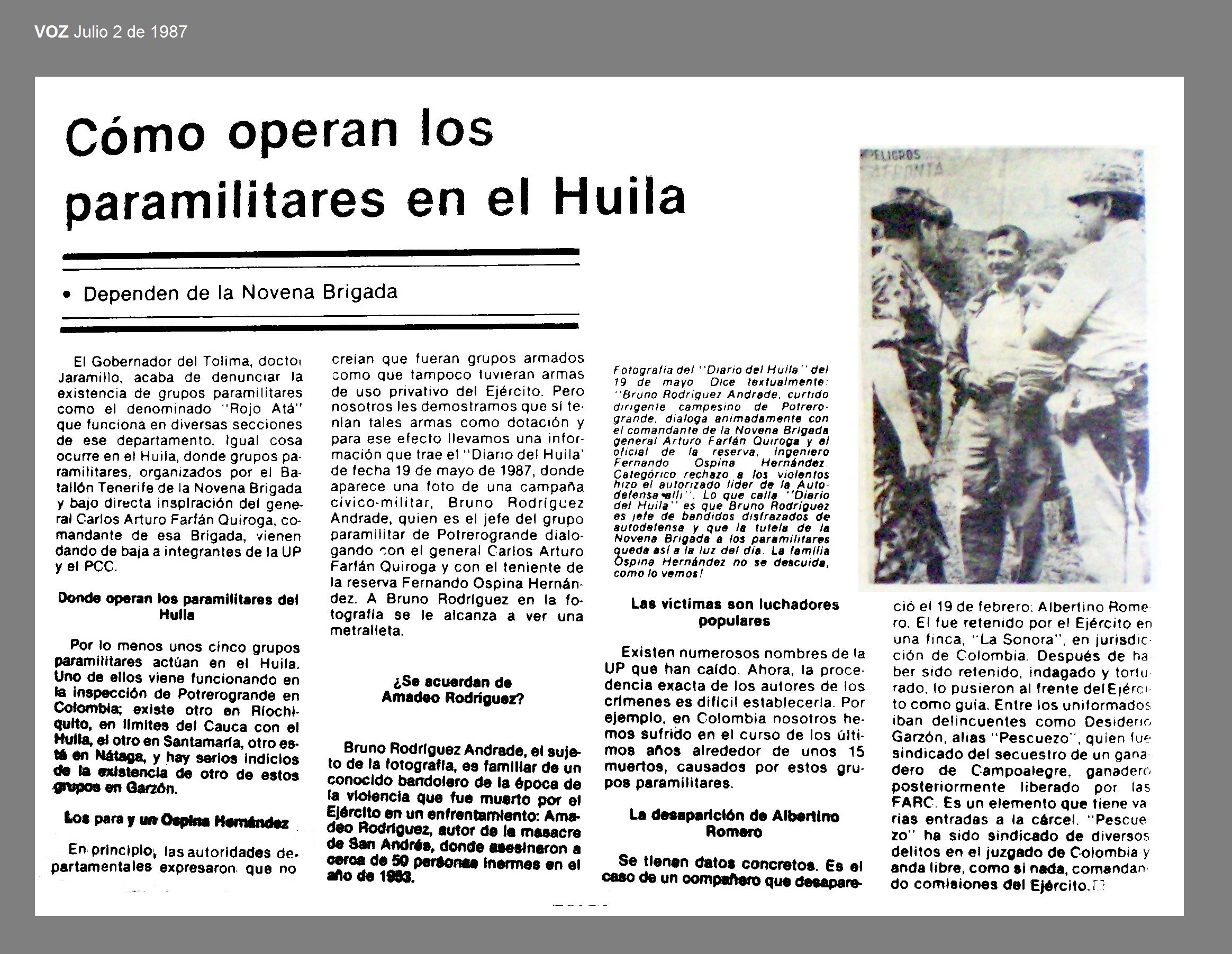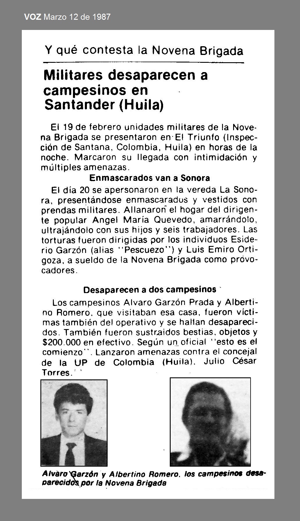 El 20 de febrero de 1987 en la vereda La Sonora, municipio de Colombia (Huila) los agricultores ALVARO GARZON PRADA y ALBERTINO ROMERO fueron sacados violentamente por unidades militares de la vivienda del dirigente popular, señor Angel Maria Quevedo, donde practicaron un allanamiento. Autoridades militares niegan información acerca de su paradero (1). Albertino era militante de la Unión Patriótica (2).
