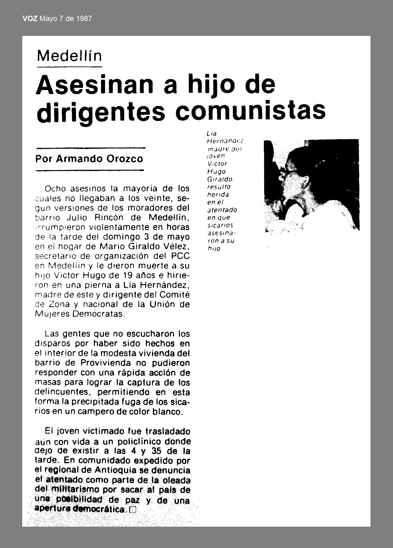 El 3 de mayo de 1987 en Medellín, Antioquia, paramilitares asesinaron a VÍCTOR HUGO GIRALDO HERNÁNDEZ, 19 años, activista estudiantil y militante de la Unión Patriótica.