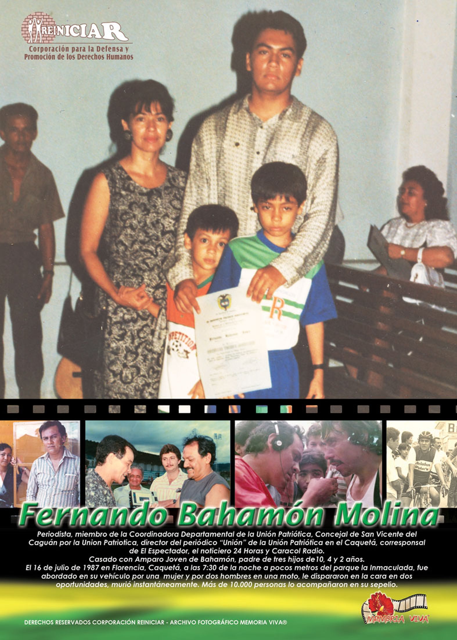 El 16 de julio de 1987 en Florencia, Caquetá, sicarios a sueldo del militarismo dispararon contra la humanidad del periodista FERNANDO BAHAMÓN MOLINA, segándole la vida. Bahamón era miembro de la coordinadora Departamental de la Unión Patriótica, concejal de la localidad, director del periódico Unión de la UP en el Caquetá, corresponsal de El Espectador, reportero del Noticiero 24 Horas y reportero de planta de La Voz de la Selva, afiliada a Caracol.
