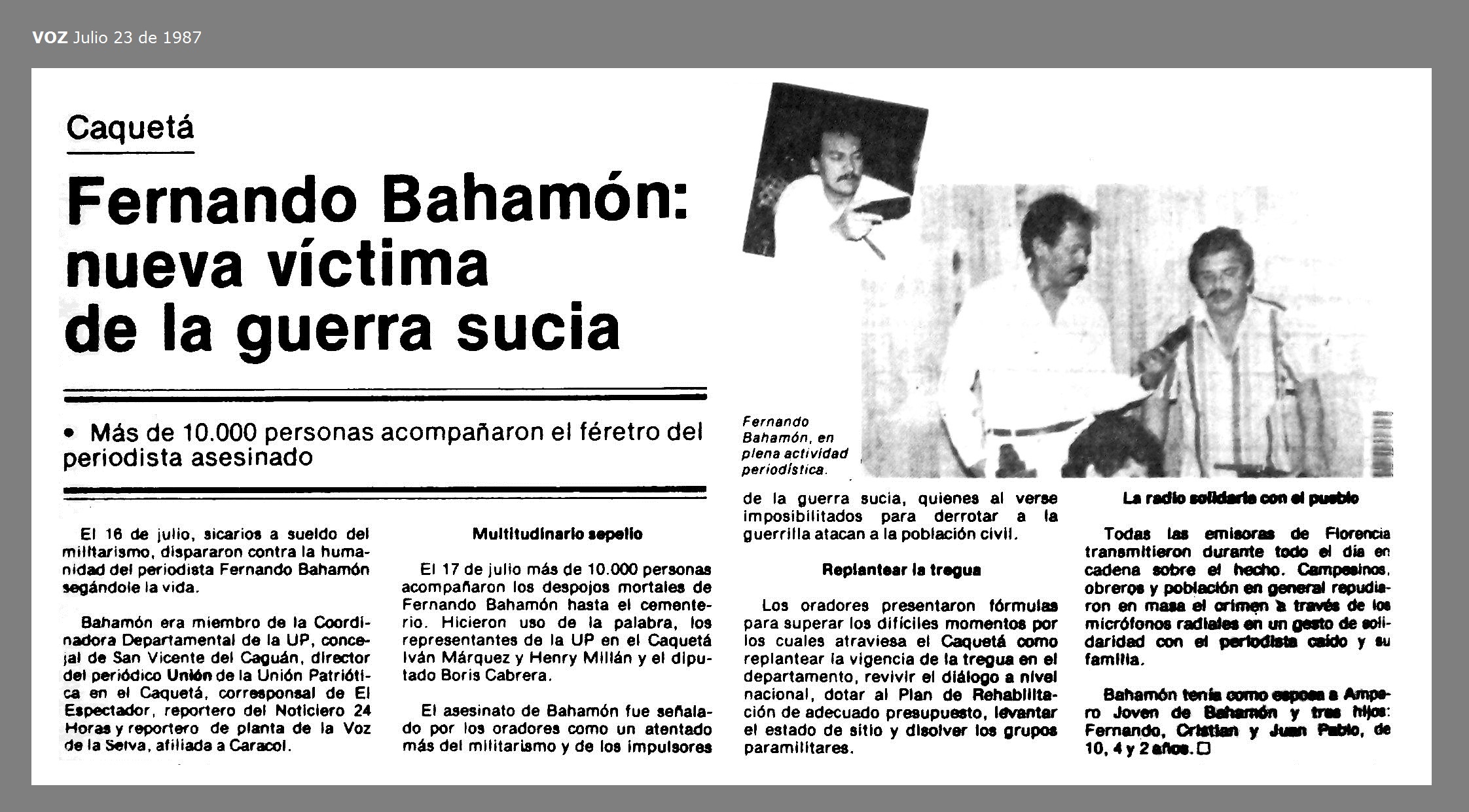 1. FERNANDO BAHAMÓN NUEVA VICTIMA DE LA GUERRA SUCIA - VOZ, julio 23 de 1987