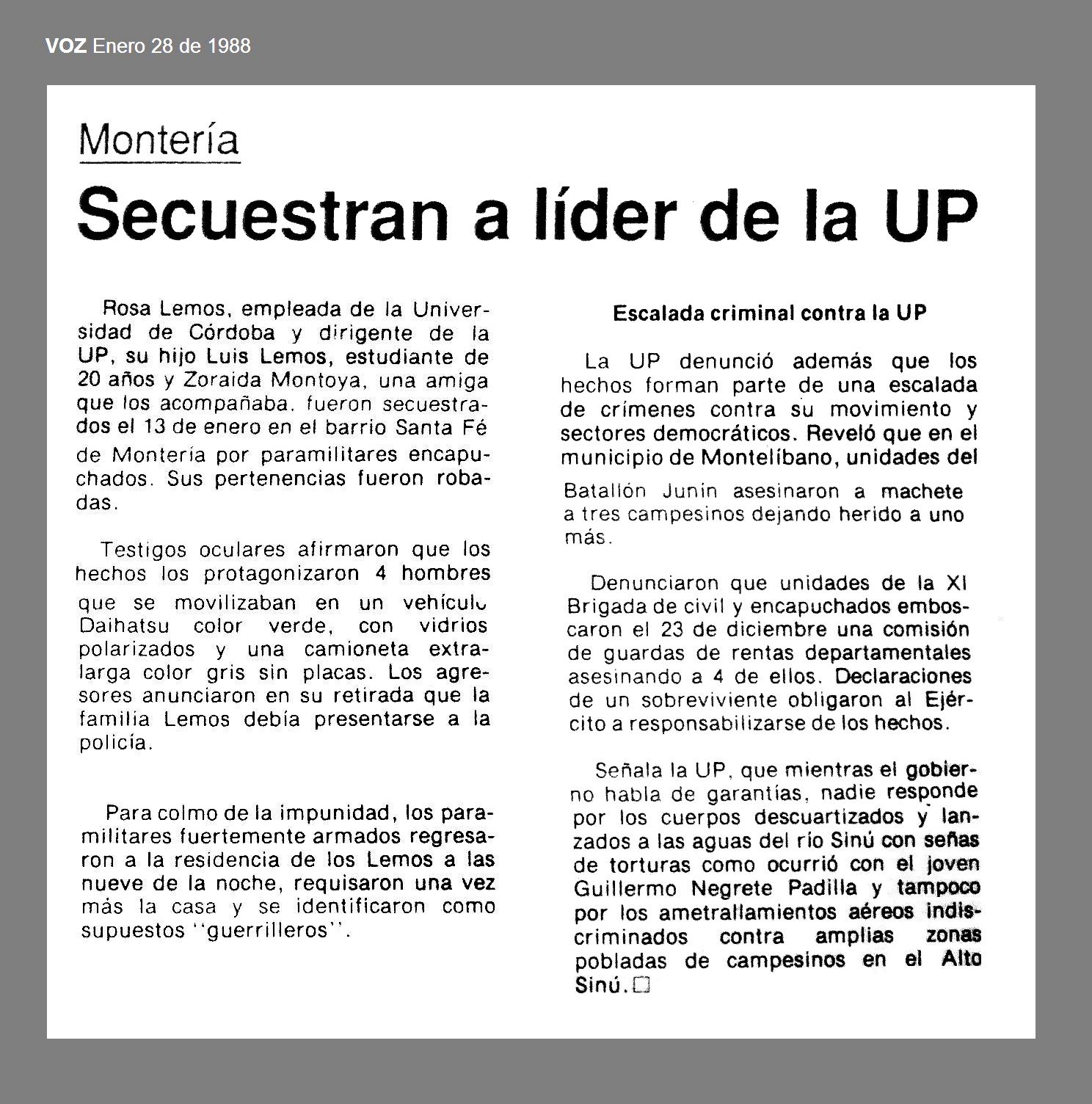 El 13 de enero de 1988 en Montería, Córdoba, paramilitares detuvieron y desaparecieron a los militantes de la Unión Patriótica, ROSA LEMOS, su hijo LUIS LEMOS y ZORAIDA MONTOYA (1). Rosa Lemos, empleada de la Universidad de Córdoba y dirigente de la UP, su hijo Luis Lemos, estudiante de 20 años y Zoraida Montoya, una amiga que los acompañaba, fueron secuestrados el 13 de enero en el barrio Santa Fé de Montería por paramilitares encapuchados. Sus pertenencias fueron robadas. Testigos oculares afirmaron que los hechos los protagonizaron 4 hombres que se movilizaban en un vehículo Daihatsu color verde, con vidrios polarizados y una camioneta extralarga color gris sin placas. Los agresores anunciaron en su retirada que la familia Lemos debía presentarse a la policía (2).
