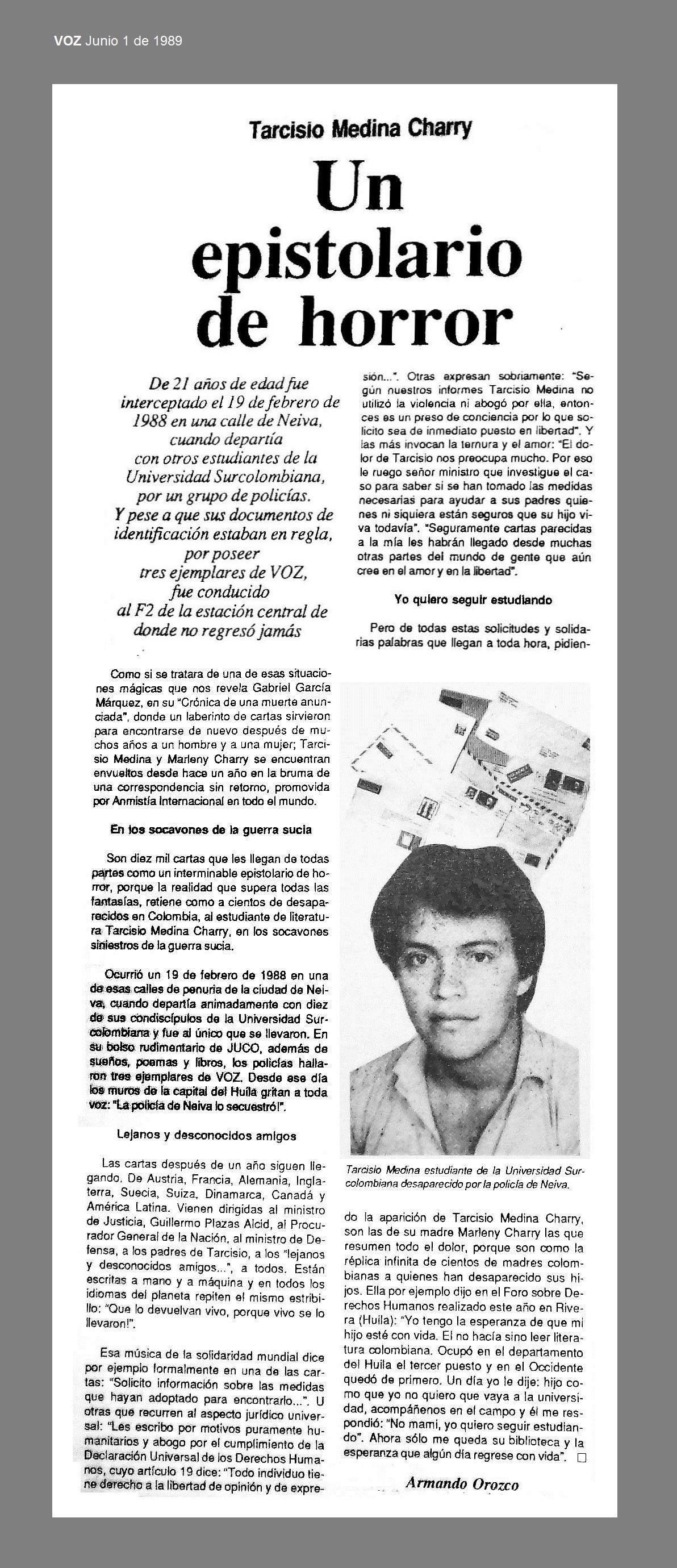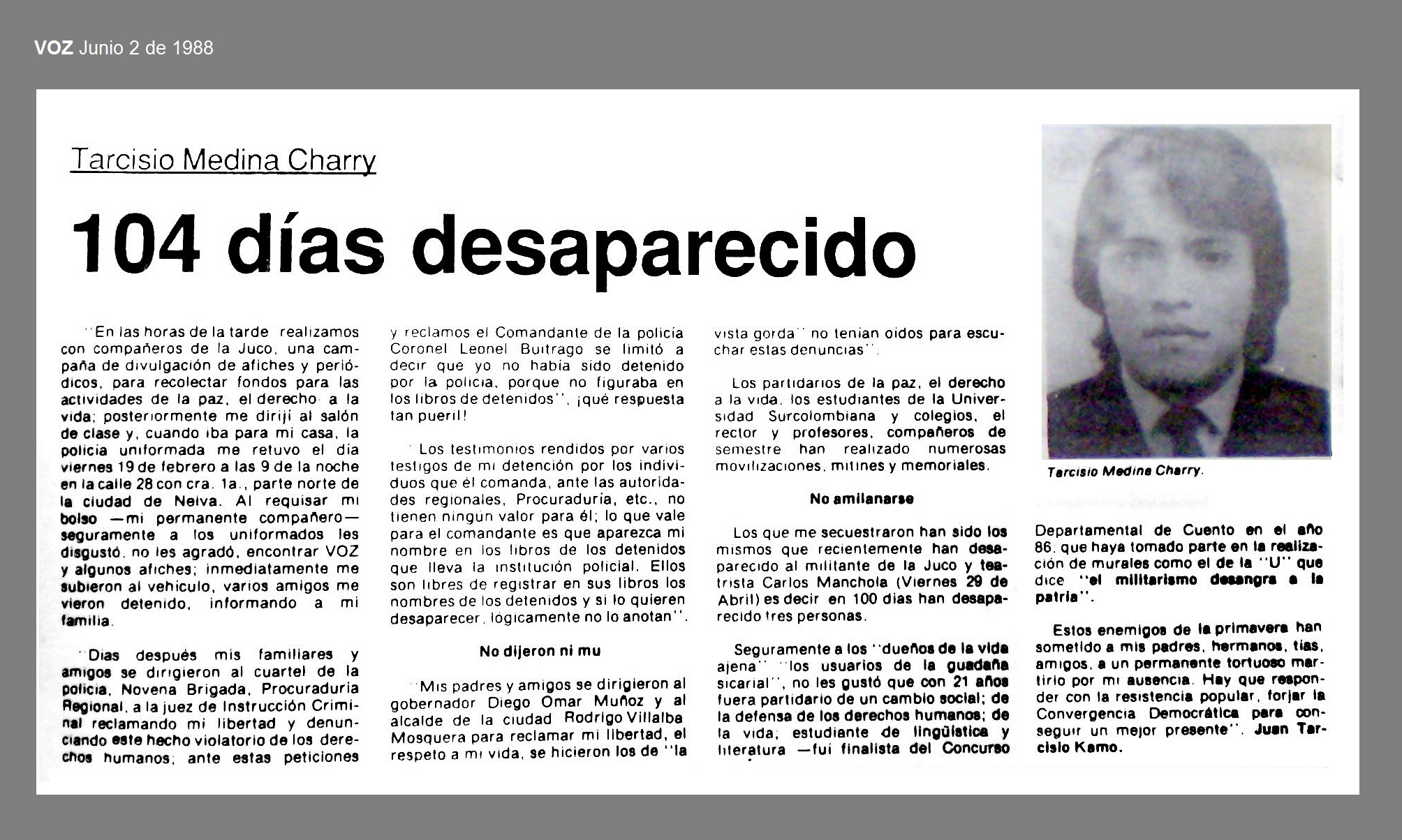 El 19 de Febrero 1988 en Neiva, Huila, el estudiante de Lingüística y Literatura de La Universidad Surcolombiana y miembro del Partido Comunista, TARCISIO MEDINA CHARRY, de 21 años de edad, fue arrestado por miembros de la división F-2 junto a otros estudiantes. Una vez trasladado al comisariato de Policía de la localidad fue separado de los otros detenidos, quienes fueron luego excarcelados. Ochos entre ellos declararon después de haber visto a Tarcisio en el comisariato pero las autoridades de Policía continúan a negar su responsabilidad en la desaparición (1).