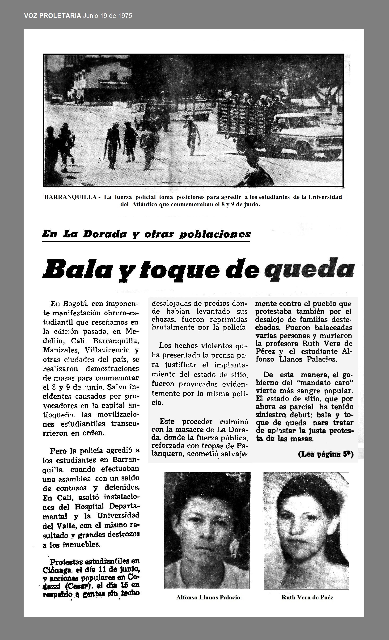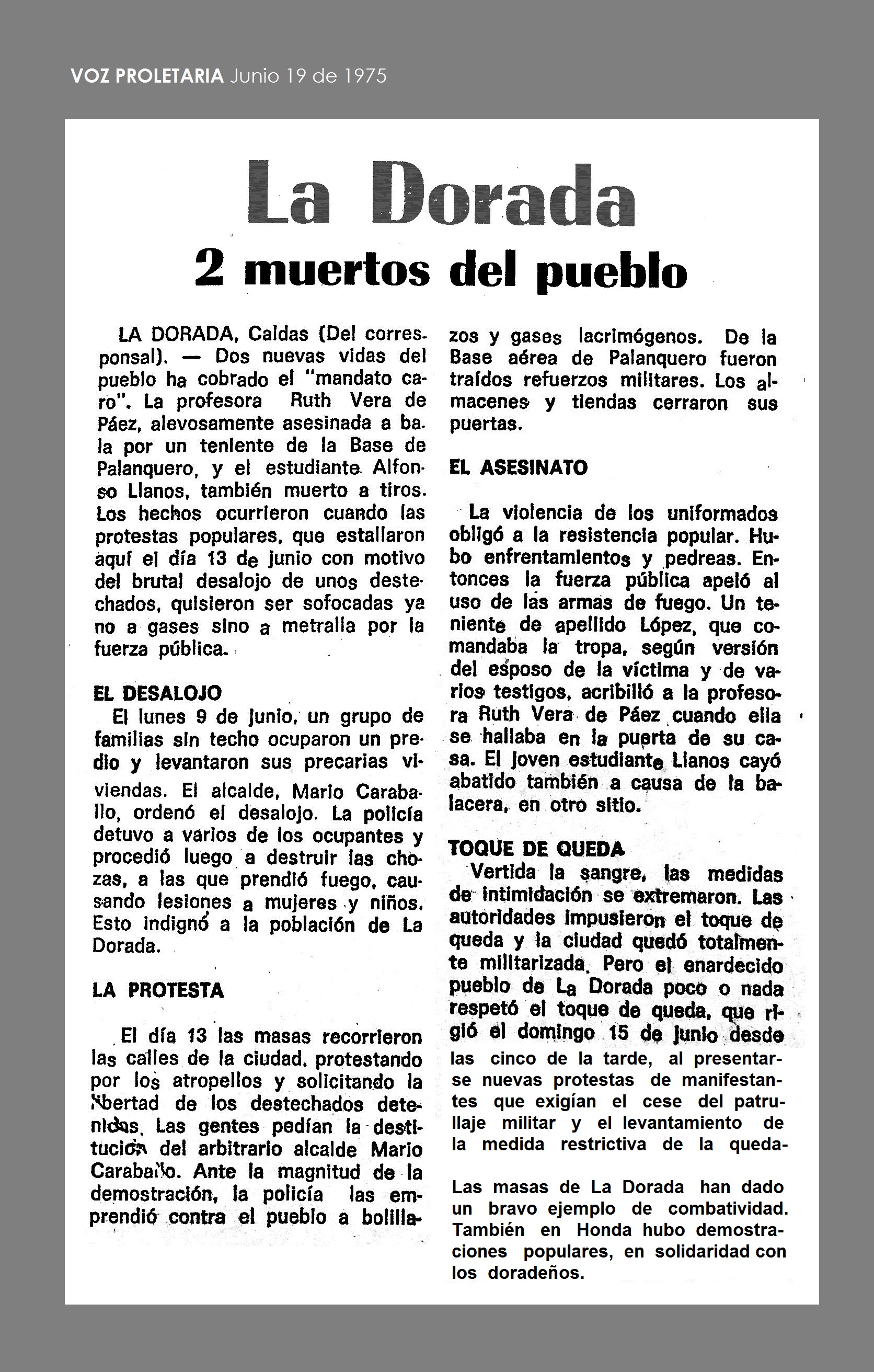 El 13 de junio de 1975 en La Dorada, Caldas, un teniente de la Base de Palanquero asesinó a tiros a la profesora RUTH ELENA VERA MARTÍNEZ (DE PÁEZ) y al estudiante LUIS ALFONSO LLANOS PALACIOS. Relata la fuente: “Los hechos ocurrieron cuando las protestas populares, que estallaron aquí el día 13 de junio con motivo del brutal desalojo de uno destechados, quisieron ser sofocadas ya no a gases sino metralla por la fuerza pública... La violencia de los uniformados obligó a la resistencia popular. Hubo enfrentamientos y pedreas. Entonces la fuerza pública apeló al uso de las armas de fuego. Un teniente de apellido López, que comandaba la tropa, según versión del esposo de la víctima y de varios testigos, acribilló a la profesora Ruth Vera de Páez cuando ella se hallaba en la puerta de su casa. El joven estudiante Llanos cayó abatido también a causa de la balacera, en otro sitio”.
