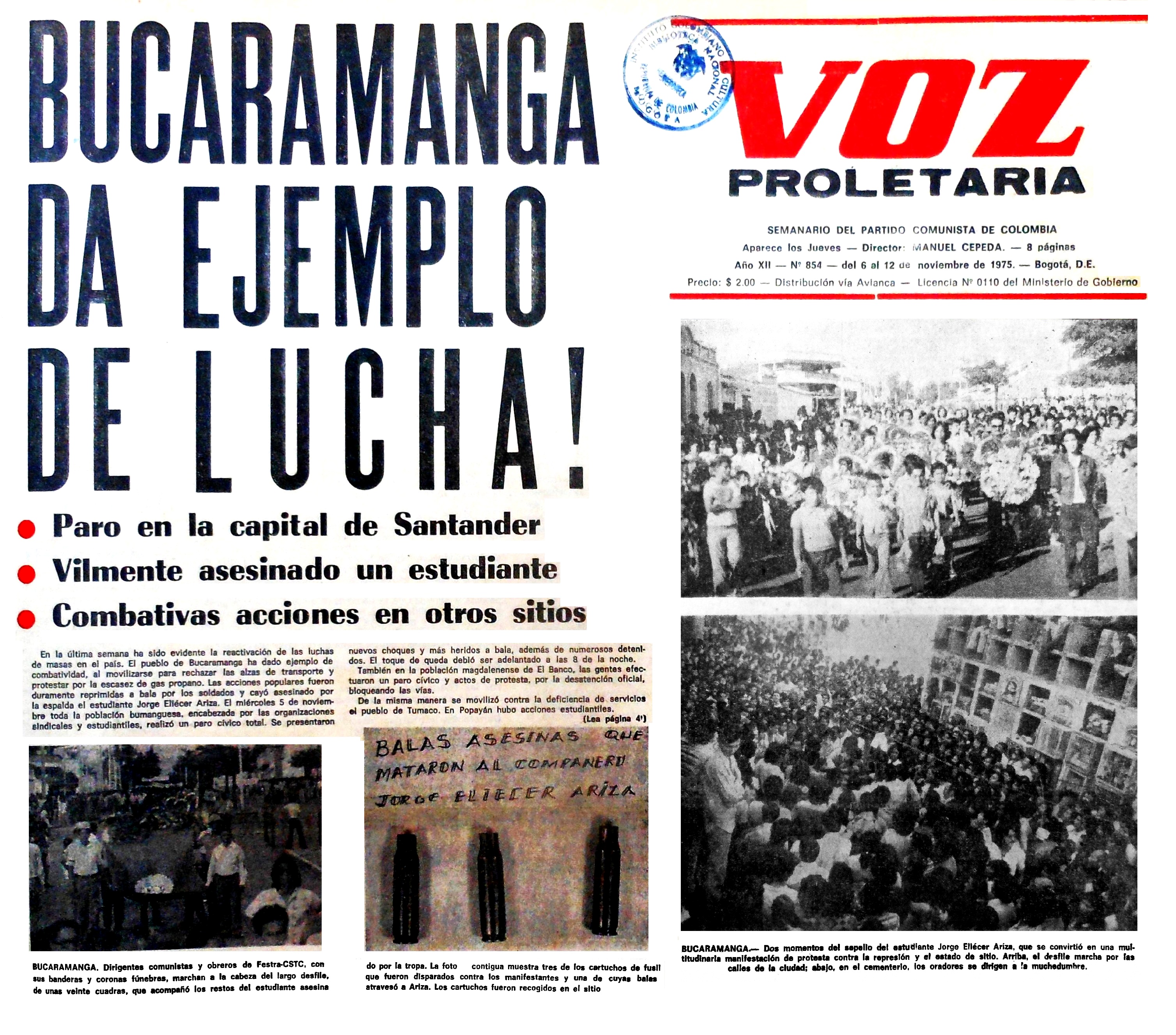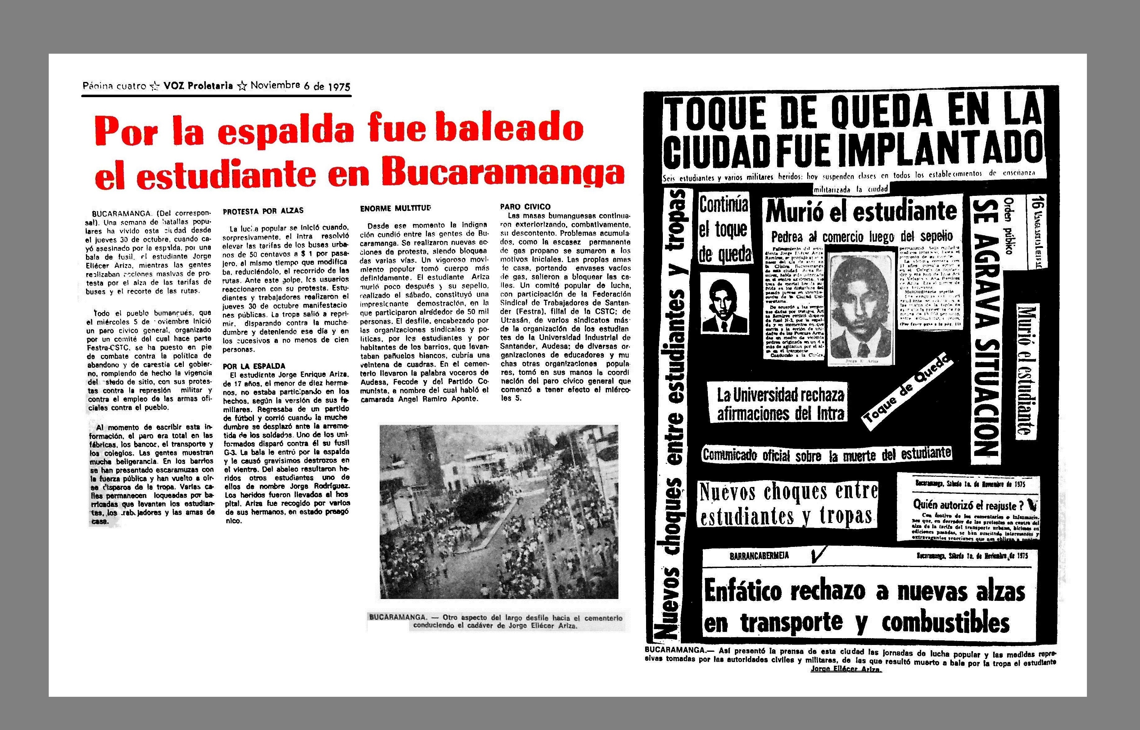 El jueves 30 de octubre de 1975 en Bucaramanga, Santander, durante una movilización hacia el centro de la ciudad de estudiantes de la Universidad Industrial de Santander, miembros del ejército asesinaron el estudiante de segundo año de bachillerato del Colegio Santander JORGE ELIECER ARIZA de 17 años e hirieron a GUSTAVO SANTOS de 16 años.
