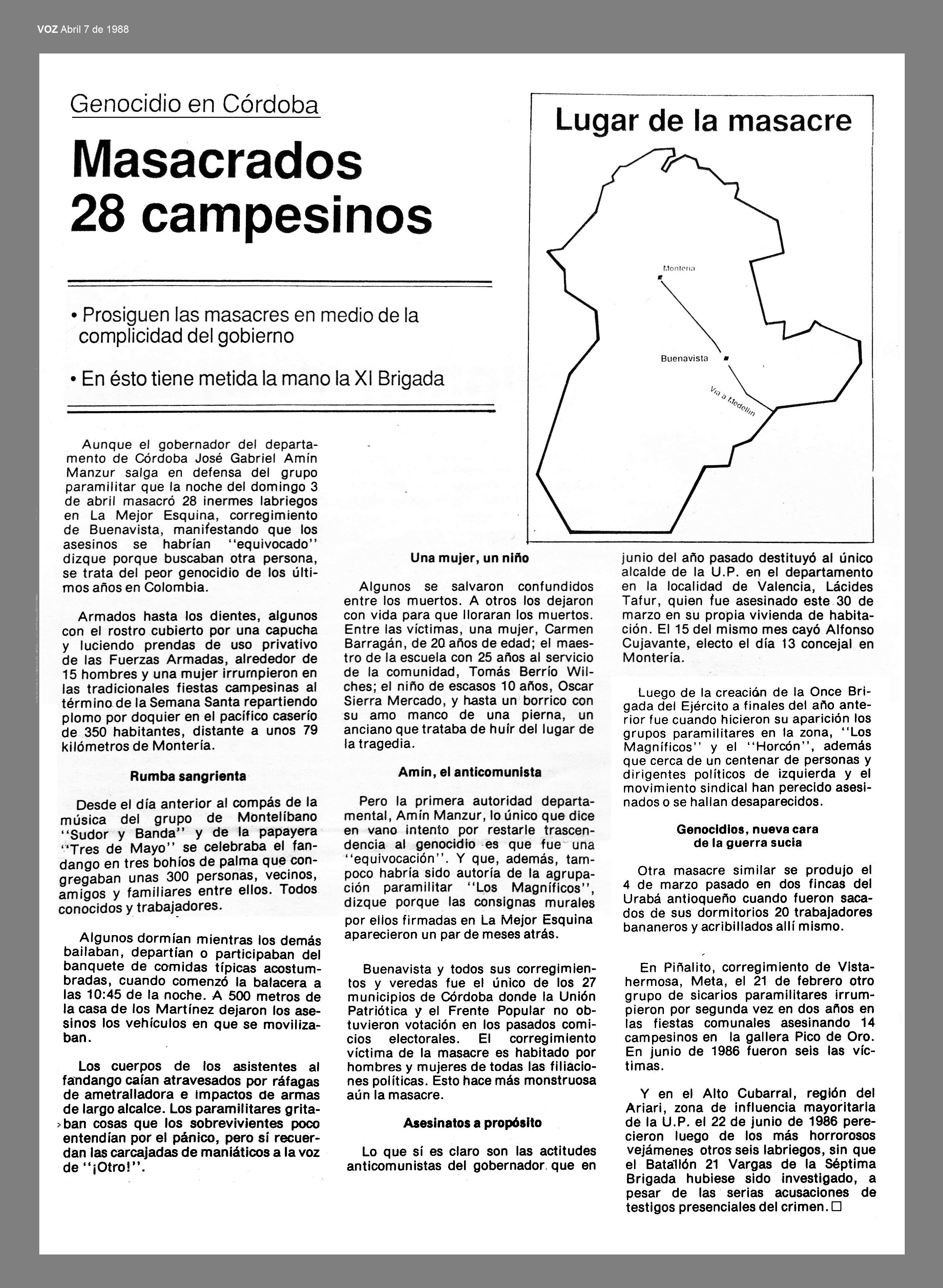 El 3 de abril de 1988 en Buenavista, Córdoba, alrededor de 15 paramilitares bajo la etiqueta de “Los Magníficos”, ejecutaron a 28 PERSONAS, una de ellas profesor de la escuela veredal y las restantes 27 campesinos, en su mayoría jóvenes, 6 de ellos pertenecientes al Frente Popular. El hecho se presentó mientras celebraban una fiesta en el caserío de MEJOR ESQUINA. El gobernador del Departamento, Gabriel Amín Manssur, declaró: “Fue un error, una lamentable equivocación de los sicarios. Mejor Esquina no es una zona de guerrilla. Un error, pues se trataba de una venganza contra uno o varios hombres”. Días antes de la masacre, la policía había detenido a jóvenes de la vereda y al ver que no figuraban en una lista, los dejaron libres. La policía de Buenavista se negó a realizar el levantamiento de los cadáveres, con el argumento de que “eran guerrilleros”.