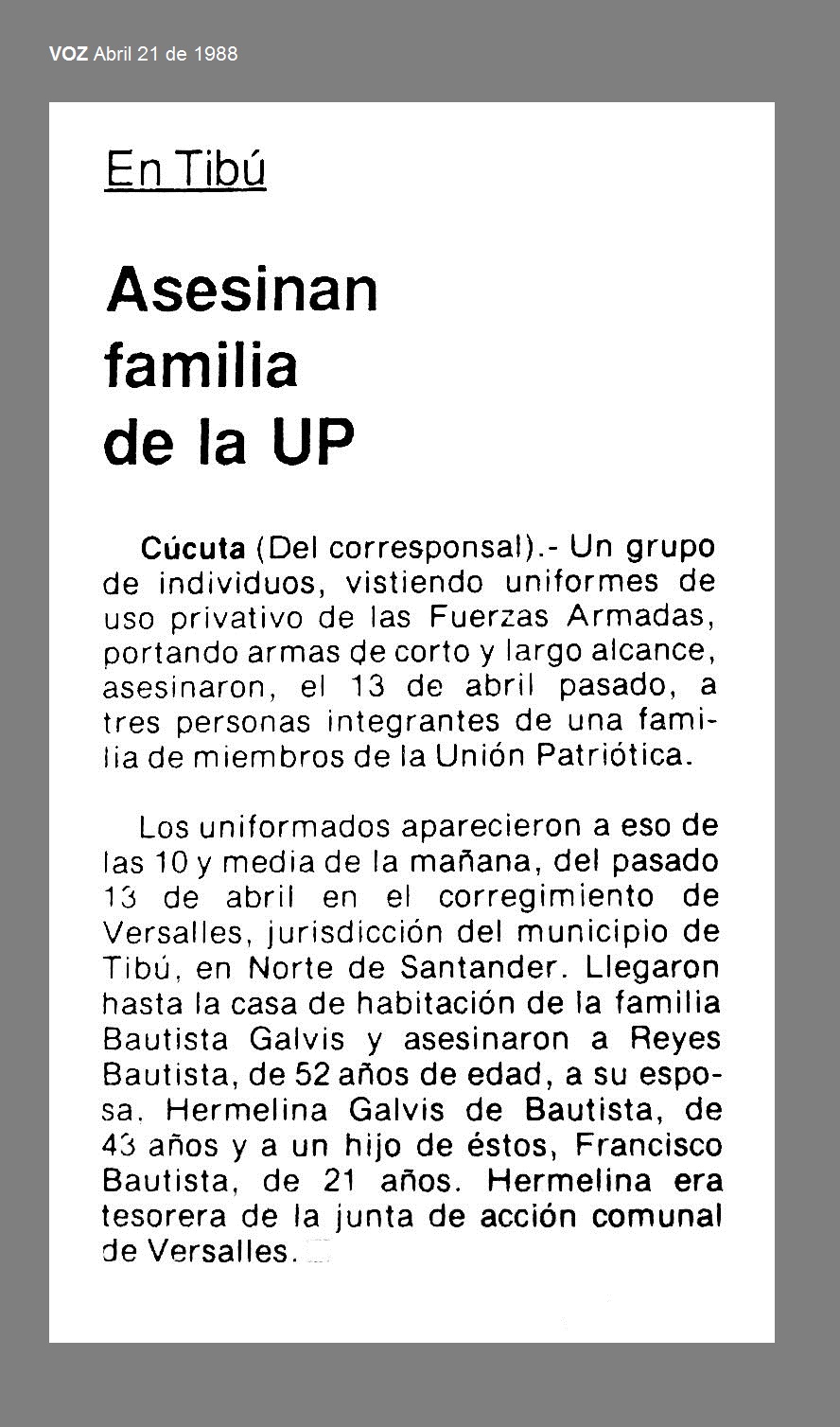 El 14 de abril de 1988 en Tibú, Norte de Santander, paramilitares que vestían prendas militares asesinaron a los militantes de la Unión Patriótica, N. BAUTISTA REYES, su esposa, HERMELINDA GÁLVIS DE BAUTISTA, e hijo, FRANCISCO BAUTISTA GÁLVIS (1). Fueron asesinados en el corregimiento de Versalles, por un grupo paramilitar que asaltó la vivienda, sacó a los labriegos, llevándolos hasta un cacaotal, donde fueron ejecutados (2).