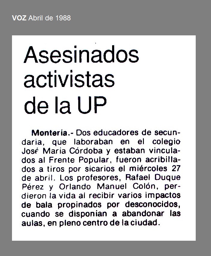 El 27 de abril de 1988 en Montería, Córdoba, paramilitares bajo la etiqueta de “Los Magníficos” asesinaron a los educadores y dirigentes del Frente Popular, ORLANDO MANUEL COLON HERNANDEZ y RAFAEL DUQUE PEREA. En un volante que los paramilitares pusieron en circulación en la ciudad de Montería se afirmaba: "RAFAEL DUQUE PEREA y ORLANDO MANUEL COLÓN HERNÁNDEZ. [...] Fueron ajusticiados porque como militantes del movimiento “Frente Popular” aprovecharon su máscara de educadores para concientizar a la juventud, para engañarla y hacer apología al comunismo (1).