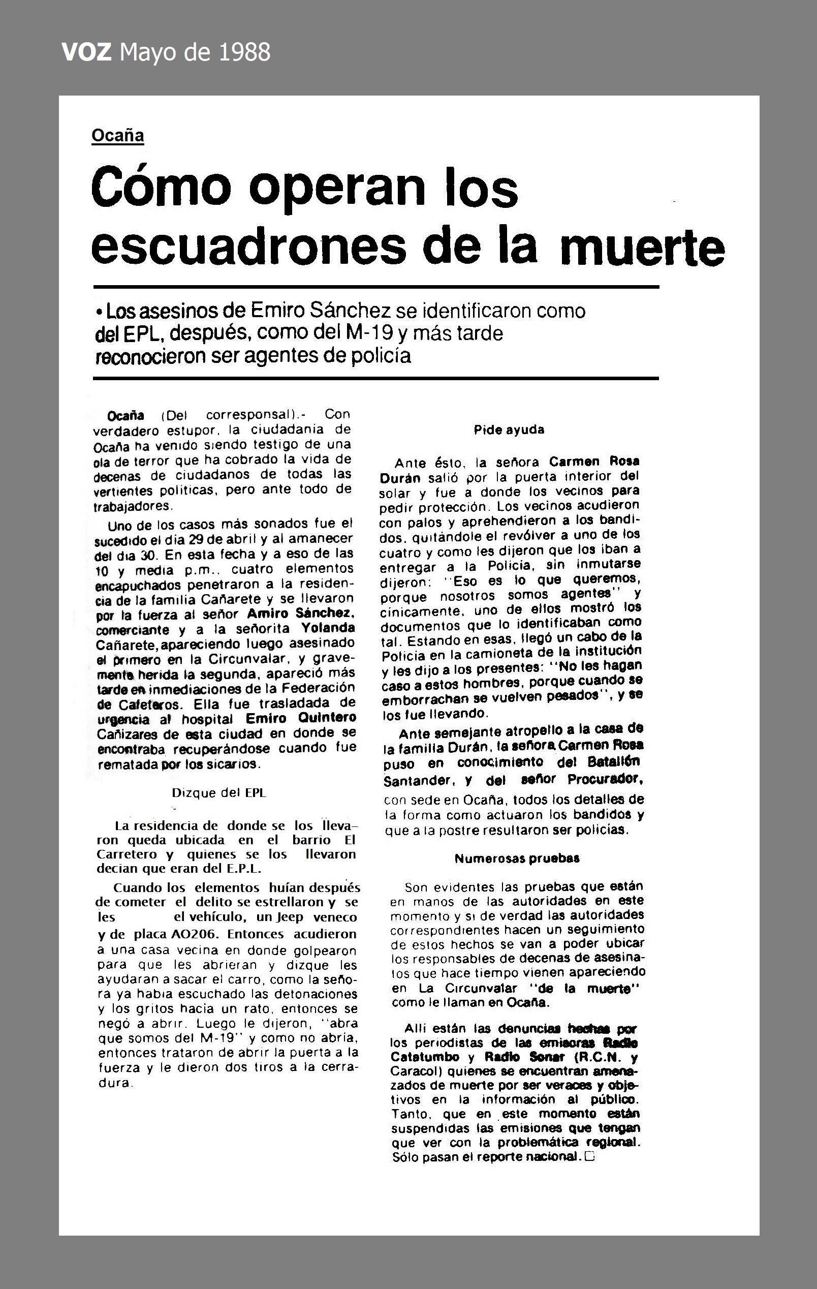 El 29 de abril de 1988 en Ocaña, Norte de Santander, a eso de las 10 y media p.m. cuatro elementos encapuchados penetraron a la residencia de la familia Cañarete y se llevaron por la fuerza al señor AMIRO SANCHEZ, comerciante y a la señorita YOLANDA CAÑARETE, apareciendo luego asesinado el primero en la Circunvalar, y gravemente herida la segunda, apareció más tarde en inmediaciones de la Federación de Cafeteros. Ella fue trasladada de urgencia al hospital Emiro Quintero Cañizares de esta ciudad en donde se encontraba recuperándose cuando fue rematada por los sicarios.