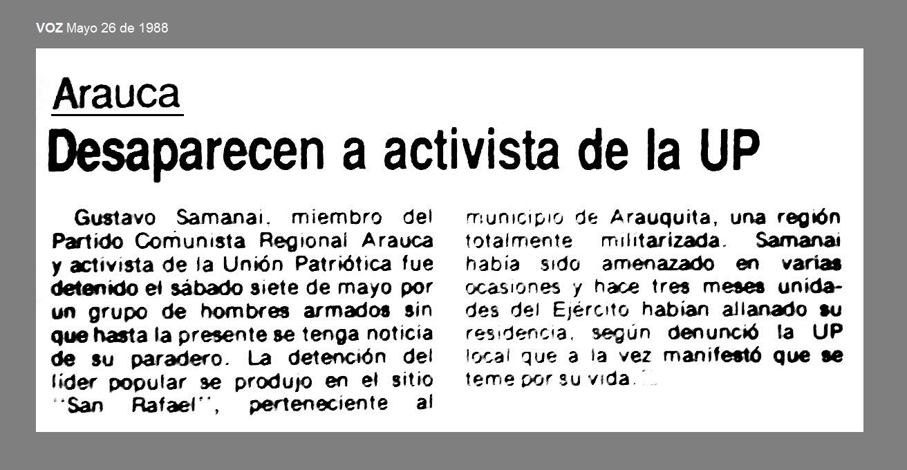 El 7 de mayo de 1988 en Arauquita, Arauca, paramilitares desaparecieron a GUSTAVO SAMANAI, militante del Partido Comunista y de la UP Unión Patriótica, en el sitio “San Rafael”. Su vivienda había sido allanada por el Ejército y había recibido amenazas de muerte .