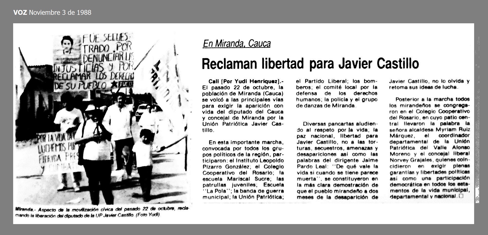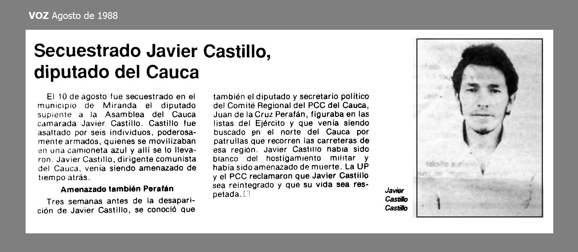 El 11 de agosto de 1988 en Miranda, Cauca, paramilitares que se transportaban en una camioneta azul, detuvieron y desaparecieron a JAVIER CASTILLO CASTILLO, concejal de este municipio y diputado de este departamento por la Unión Patriótica. Había recibido amenazas de muerte.